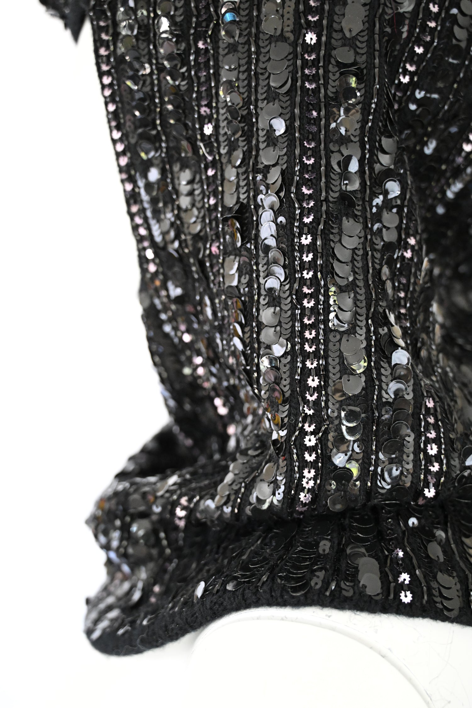 This exceptional Dolce & Gabbana Fall/Winter 2014 piece showcases the house's signature maximalist aesthetic. The hood features an intricate, fully embellished sequin design inspired by medieval knight armor, creating a striking visual narrative that merges historical references with contemporary luxury. The draped neckline adds architectural sophistication, softening the bold embellishment while maintaining the garment's dramatic presence. A standout statement piece for collectors of high-fashion runway wear and those seeking distinctive, artisanal craftsmanship.