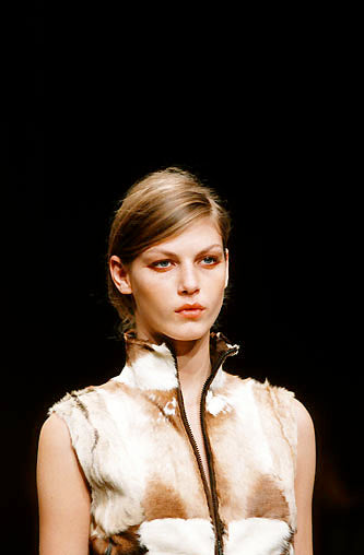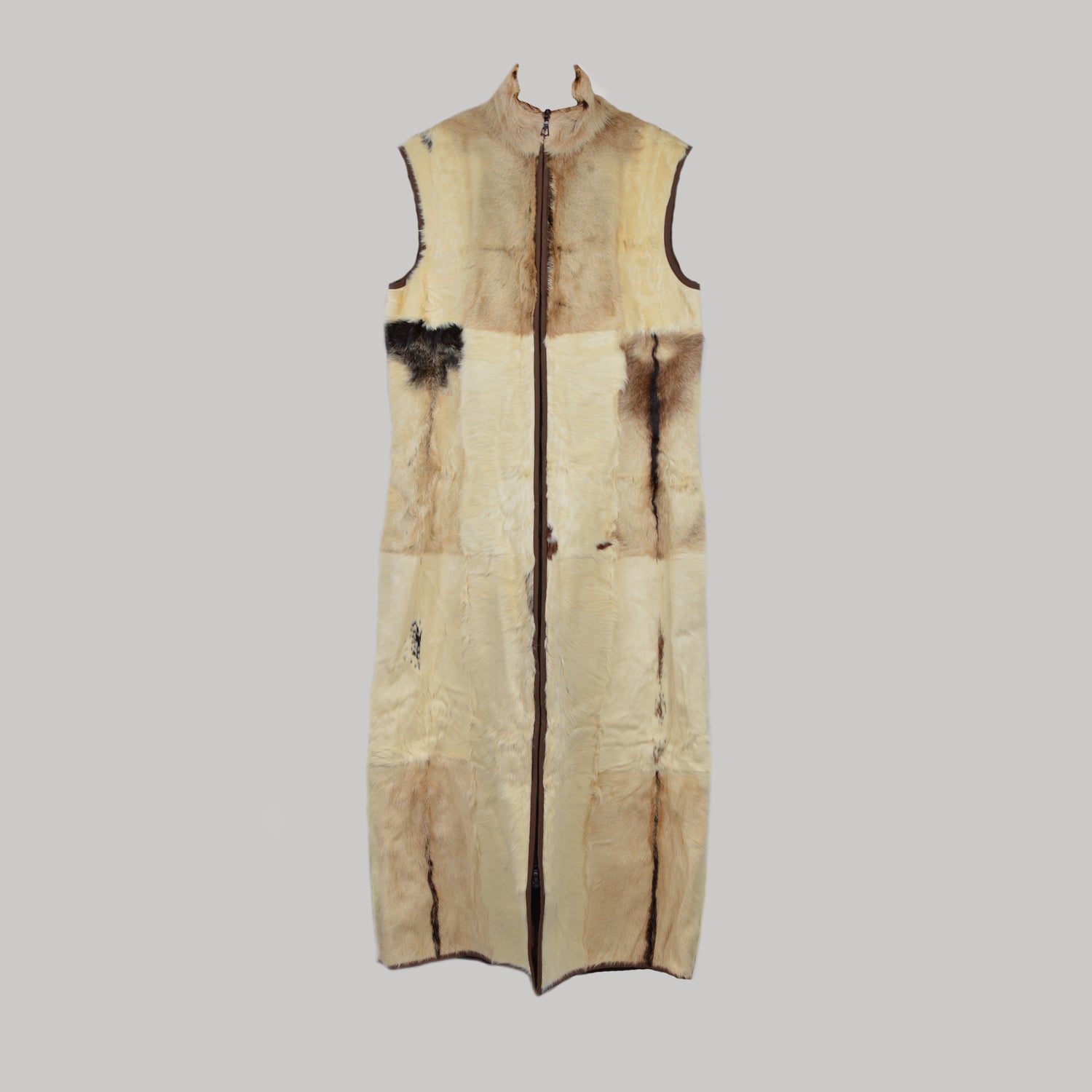 Iconic fur paneled sleeveless coat dress. Front zip closure. Side pockets.