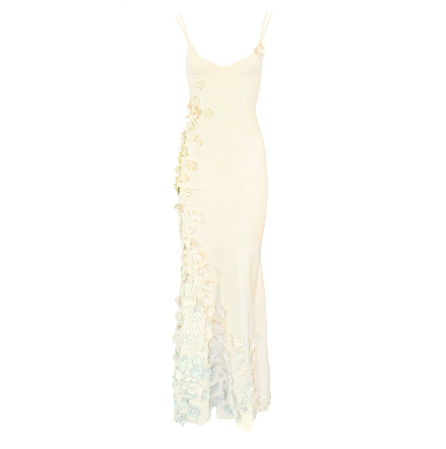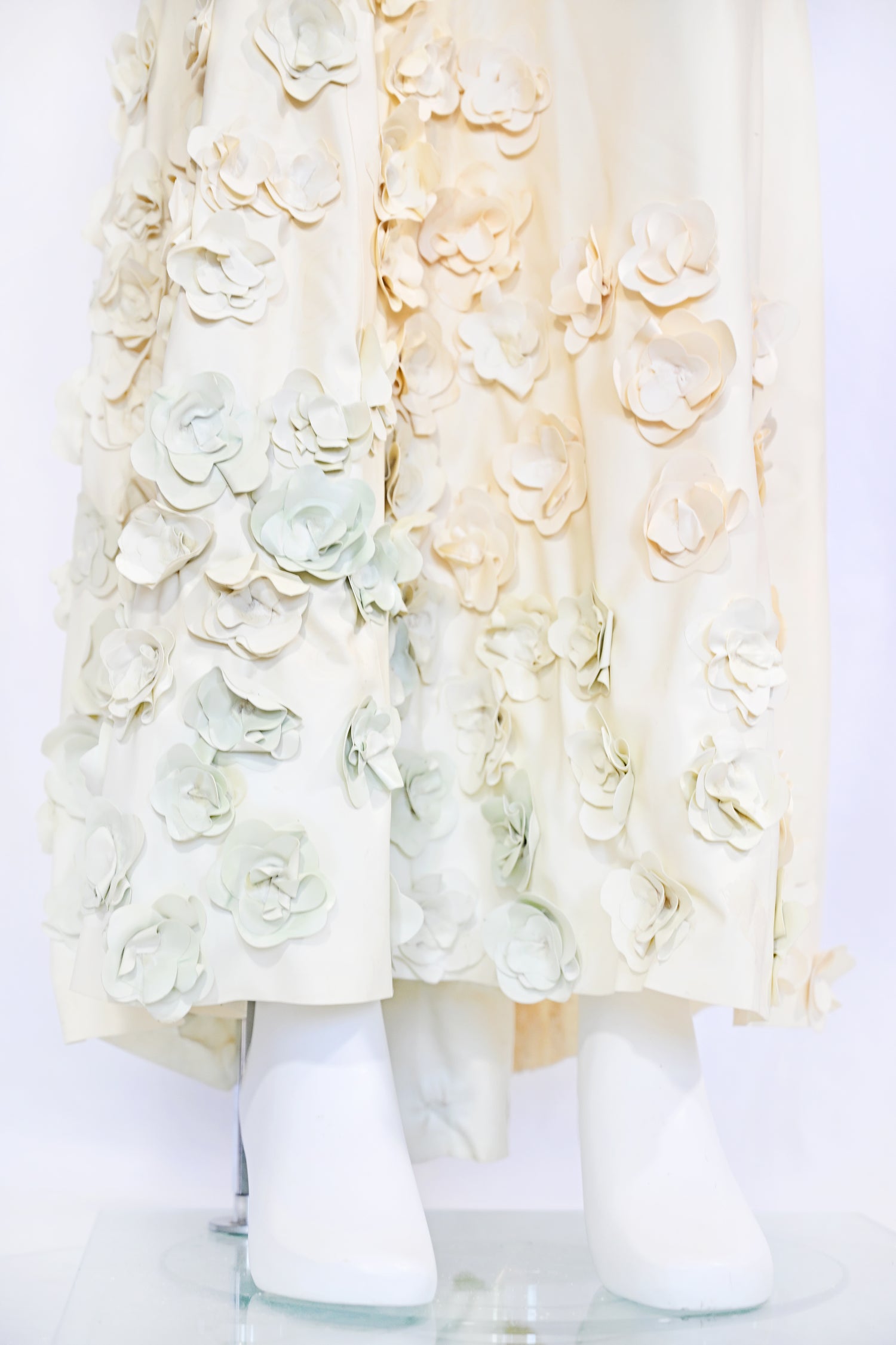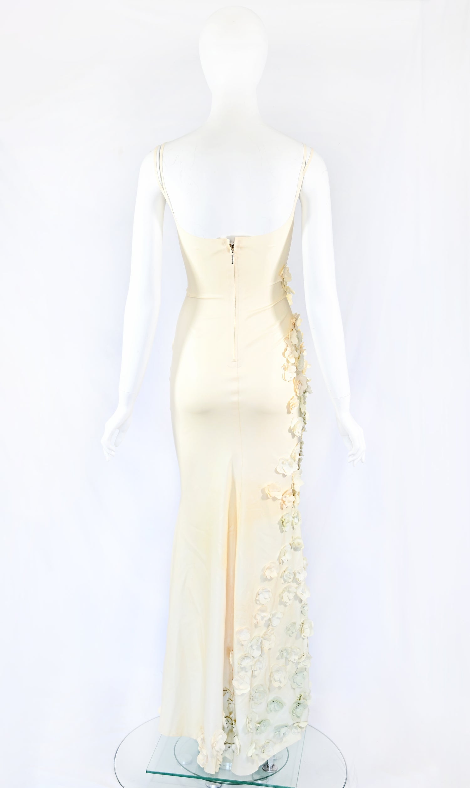 A striking piece from Gaelyn & Cianfarani's Fall/Winter 2005 collection, this runway-exclusive dress showcases innovative design through its sculptural latex construction. Delicate latex flowers cascade along the hemline, rendered in a sophisticated gradient of verdant greens that transitions from buttery yellow to soft sage. The hourglass silhouette and meticulous craftsmanship exemplify the designers' avant-garde approach to contemporary fashion. A rare find for collectors of high-fashion archival pieces and those seeking statement-making garments with artistic merit.