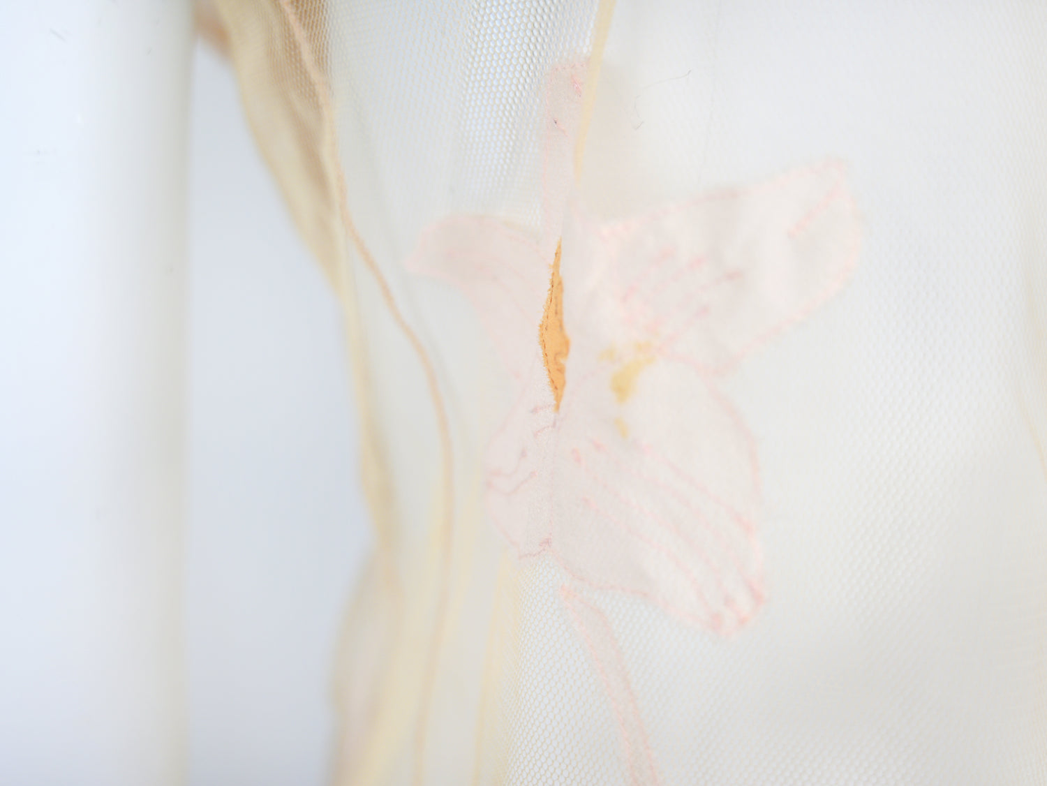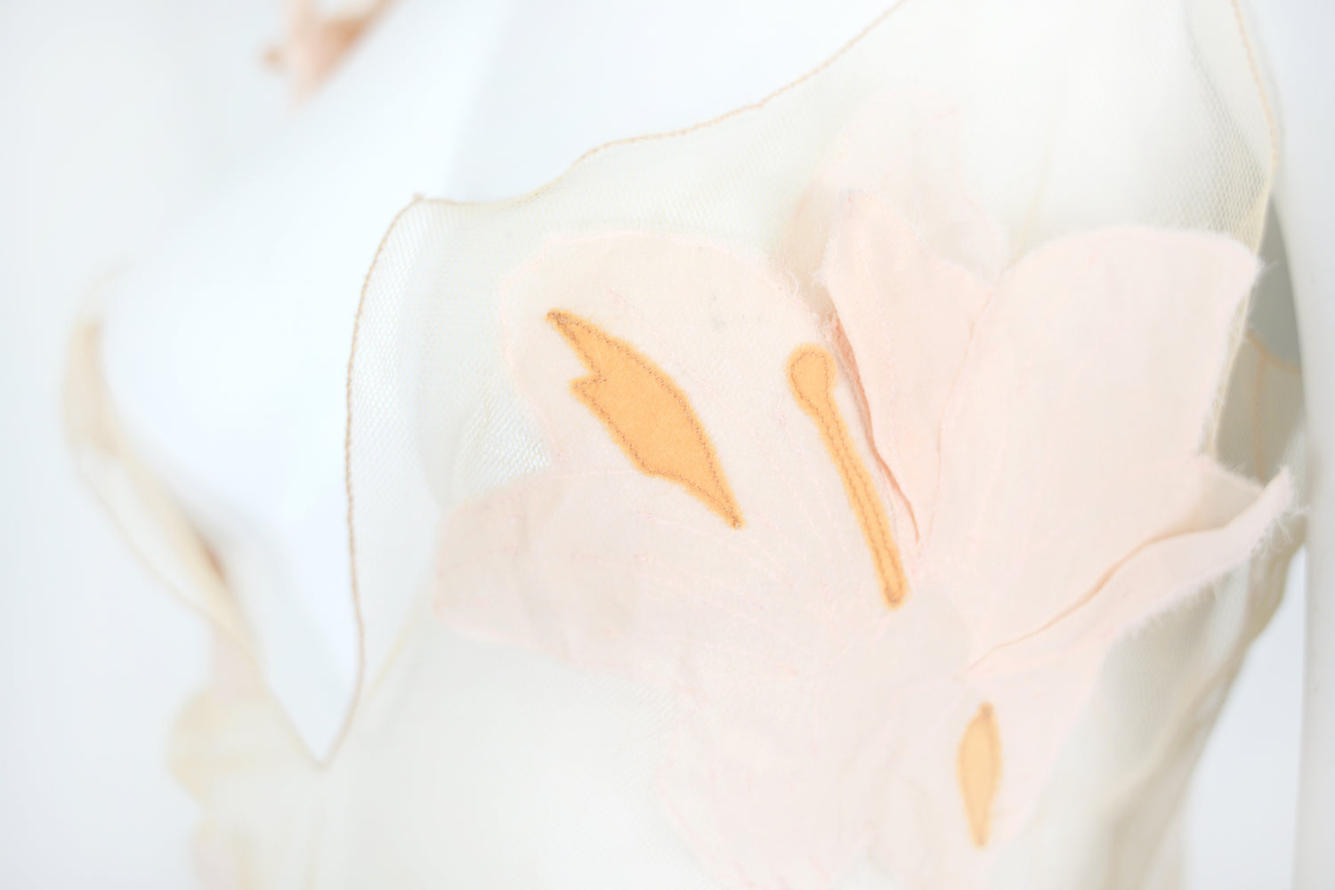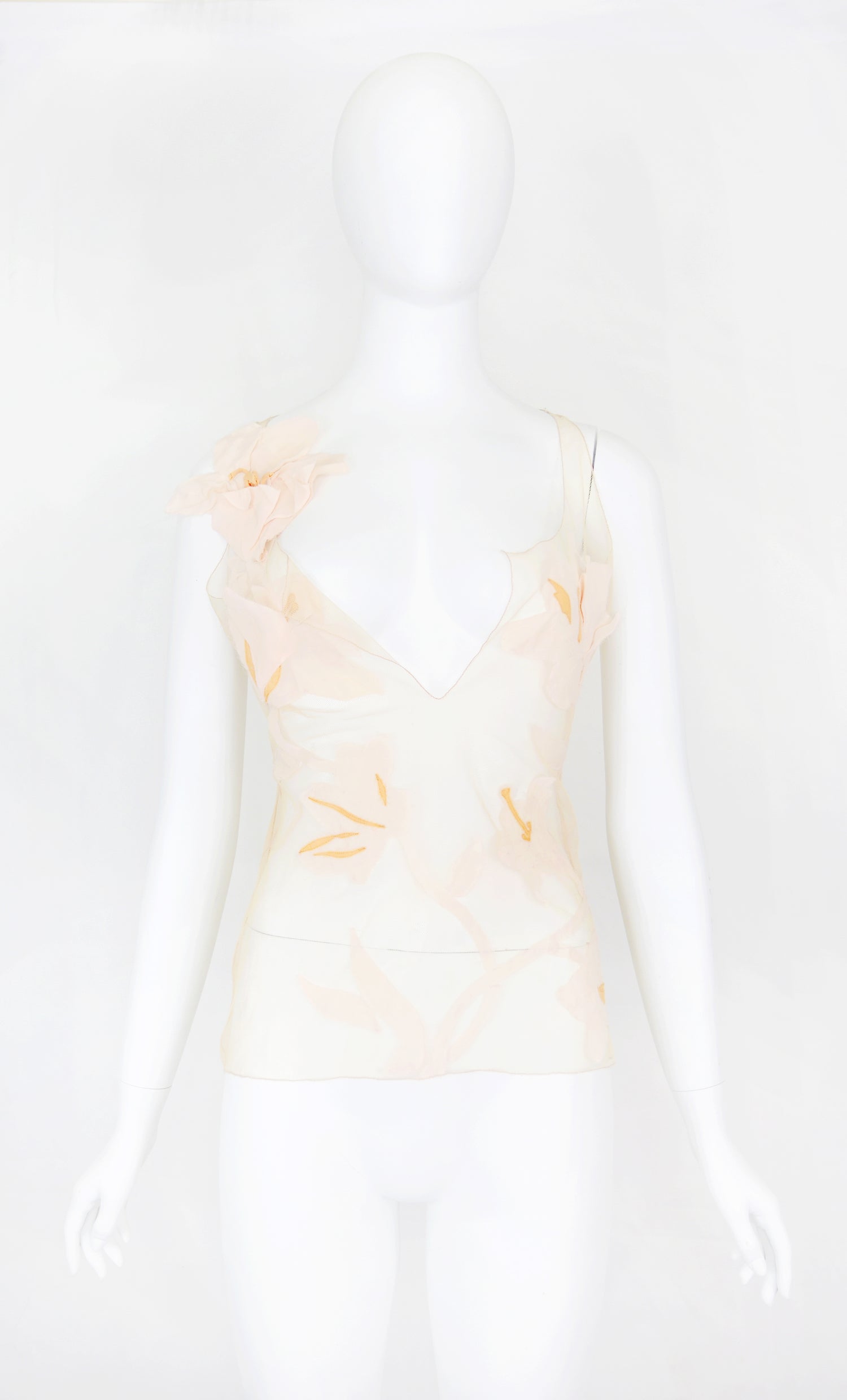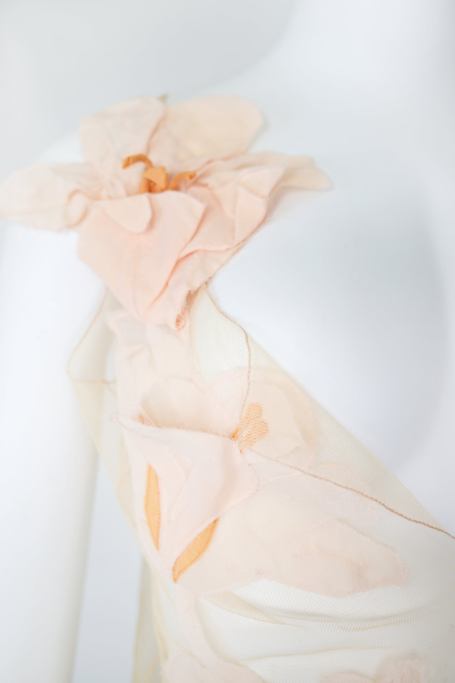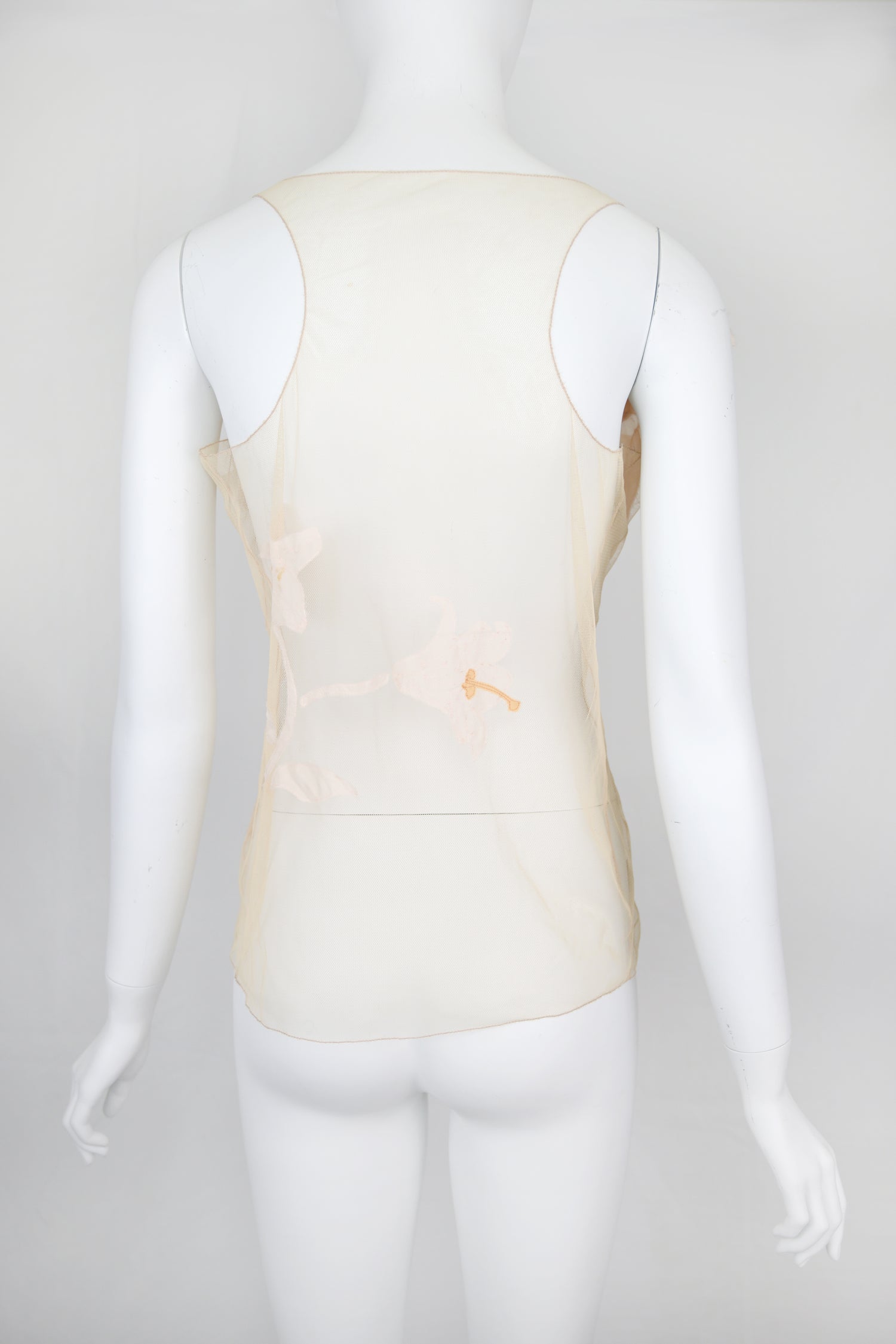 The Jasper Conran blouse features delicate chiffon flower appliqués over a light peach net tulle fabric. Seen worn on the Spring 2009 ready to wear runway collection.