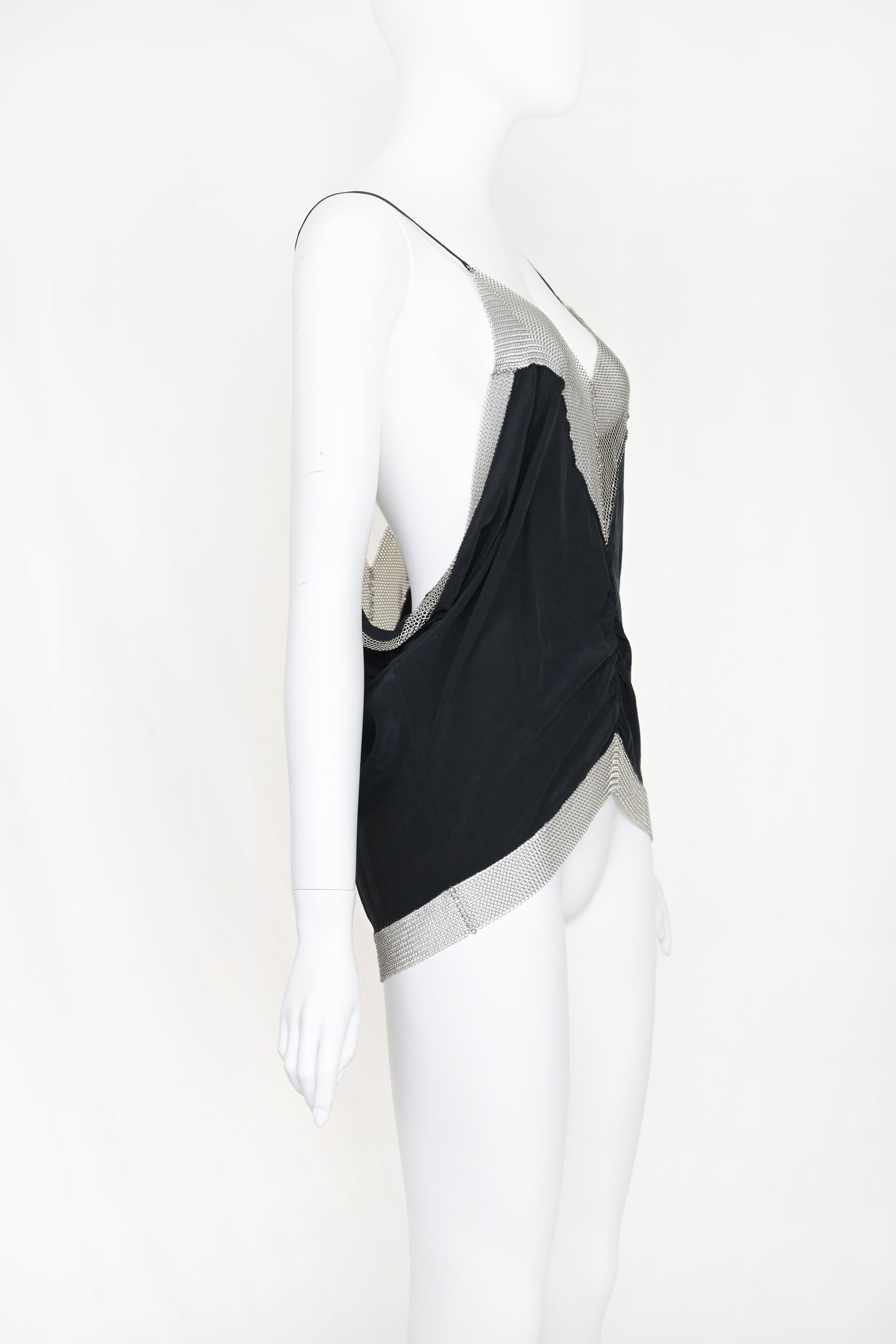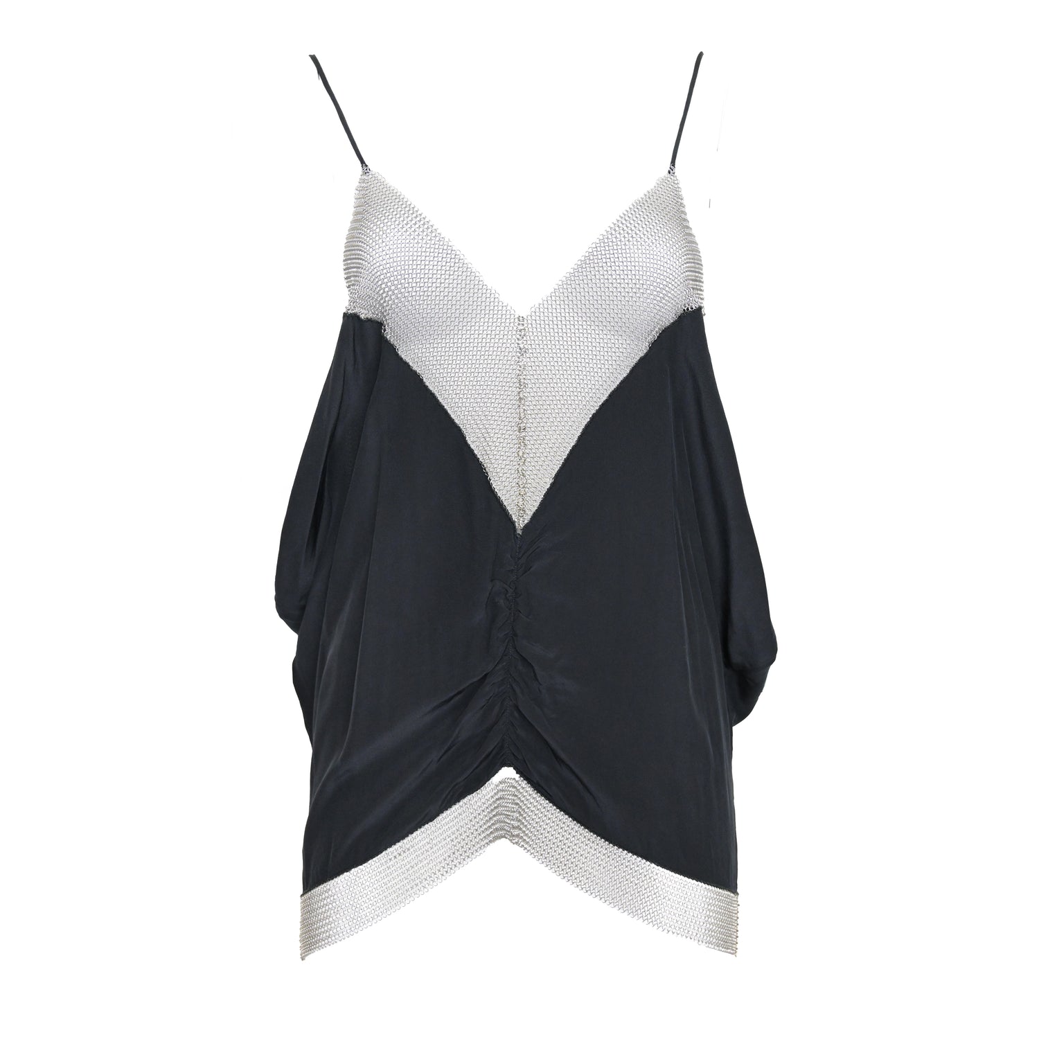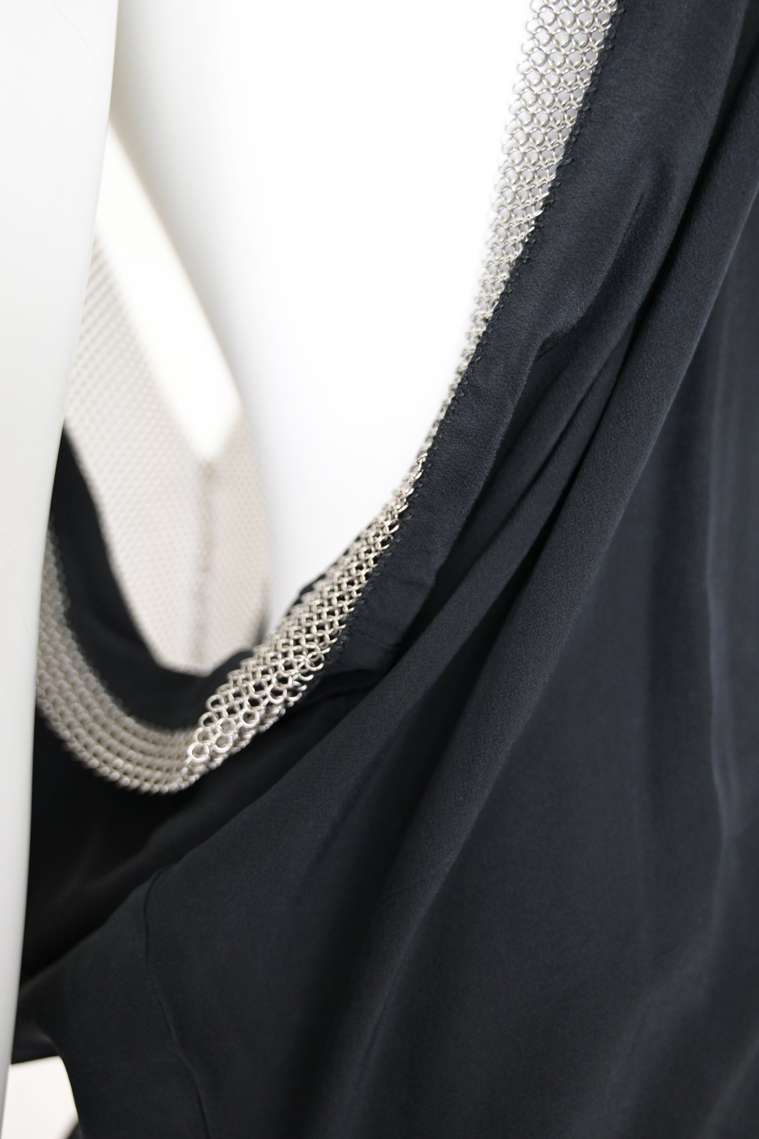Experience the perfect marriage of structure and sensuality with this navy silk blouse. Strategic gathering at the center creates cascading drape throughout, allowing the fabric to move with fluid elegance against your body. Chainmail trim rests on the bust and hips, sculpting your silhouette while the rest of the blouse flows freely, revealing just enough to create intrigue and create beautiful movement with every gesture.