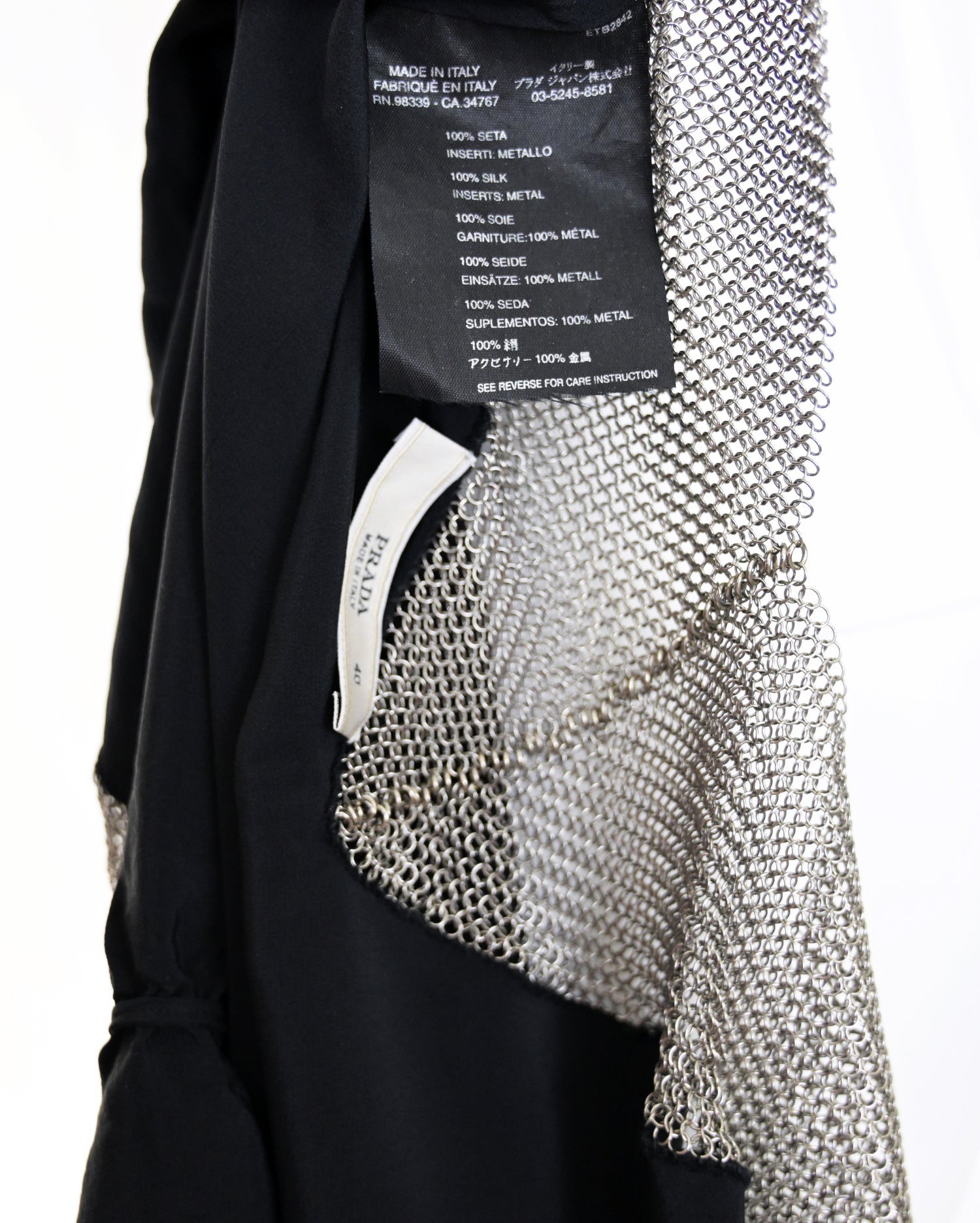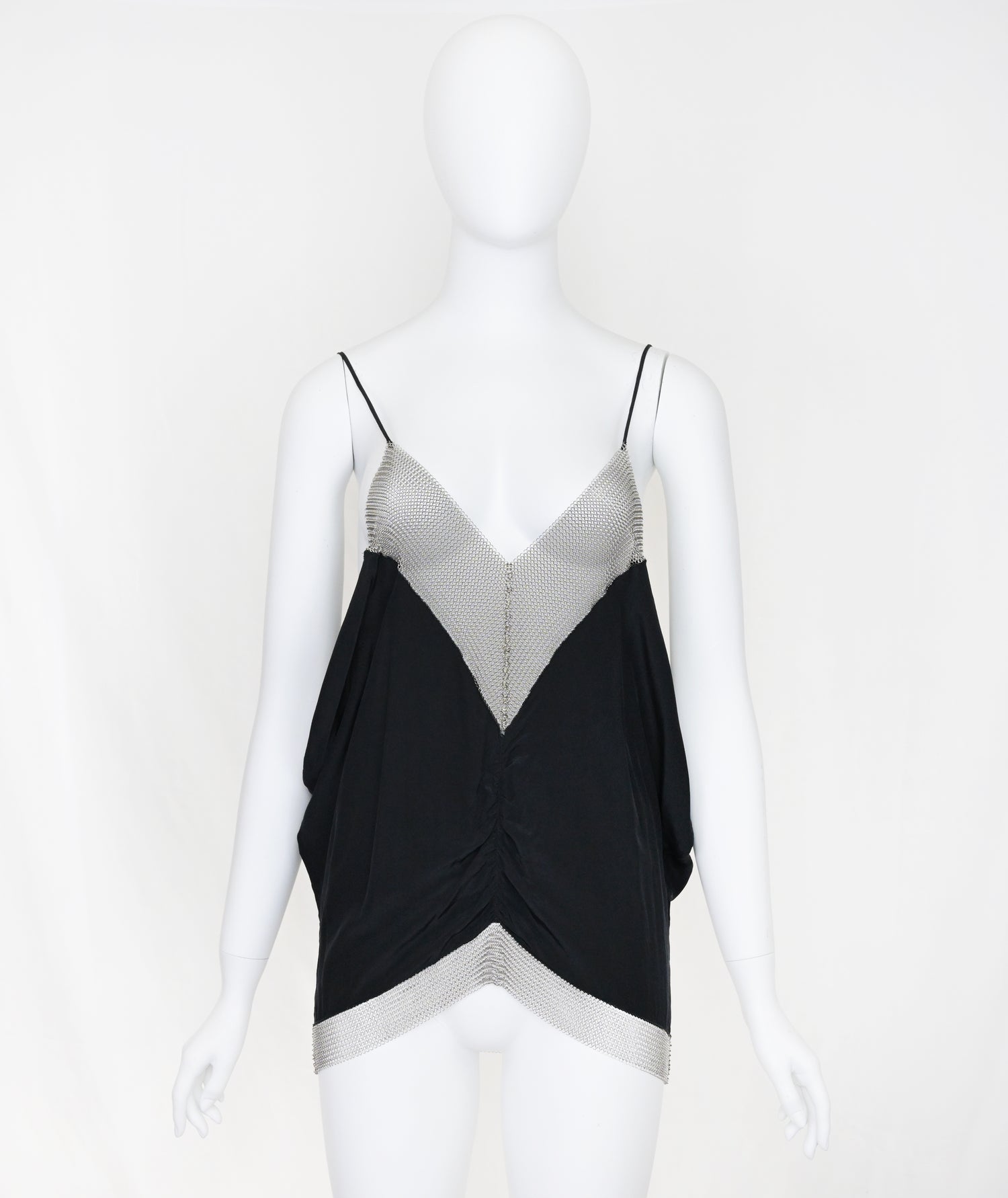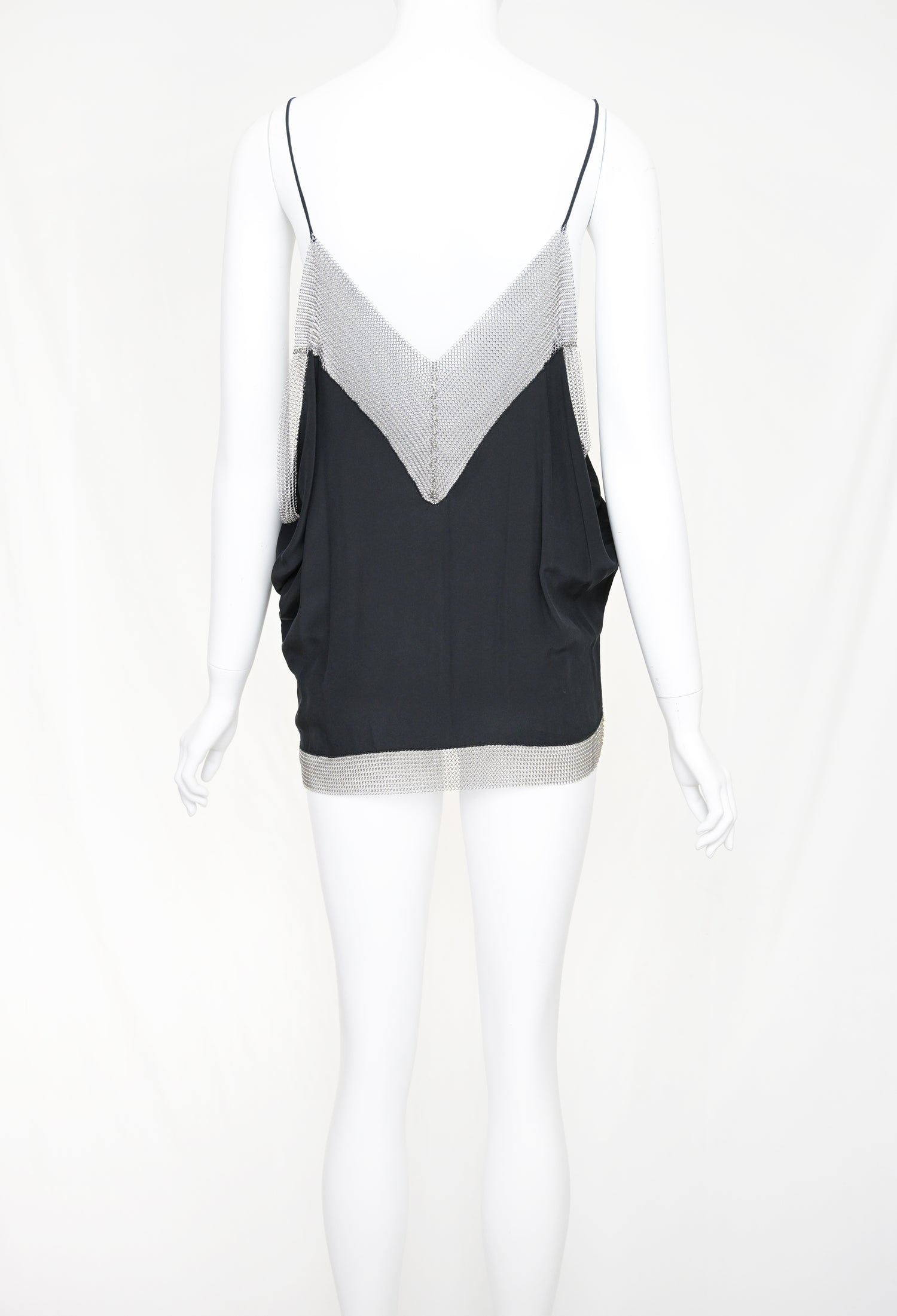 Experience the perfect marriage of structure and sensuality with this navy silk blouse. Strategic gathering at the center creates cascading drape throughout, allowing the fabric to move with fluid elegance against your body. Chainmail trim rests on the bust and hips, sculpting your silhouette while the rest of the blouse flows freely, revealing just enough to create intrigue and create beautiful movement with every gesture.