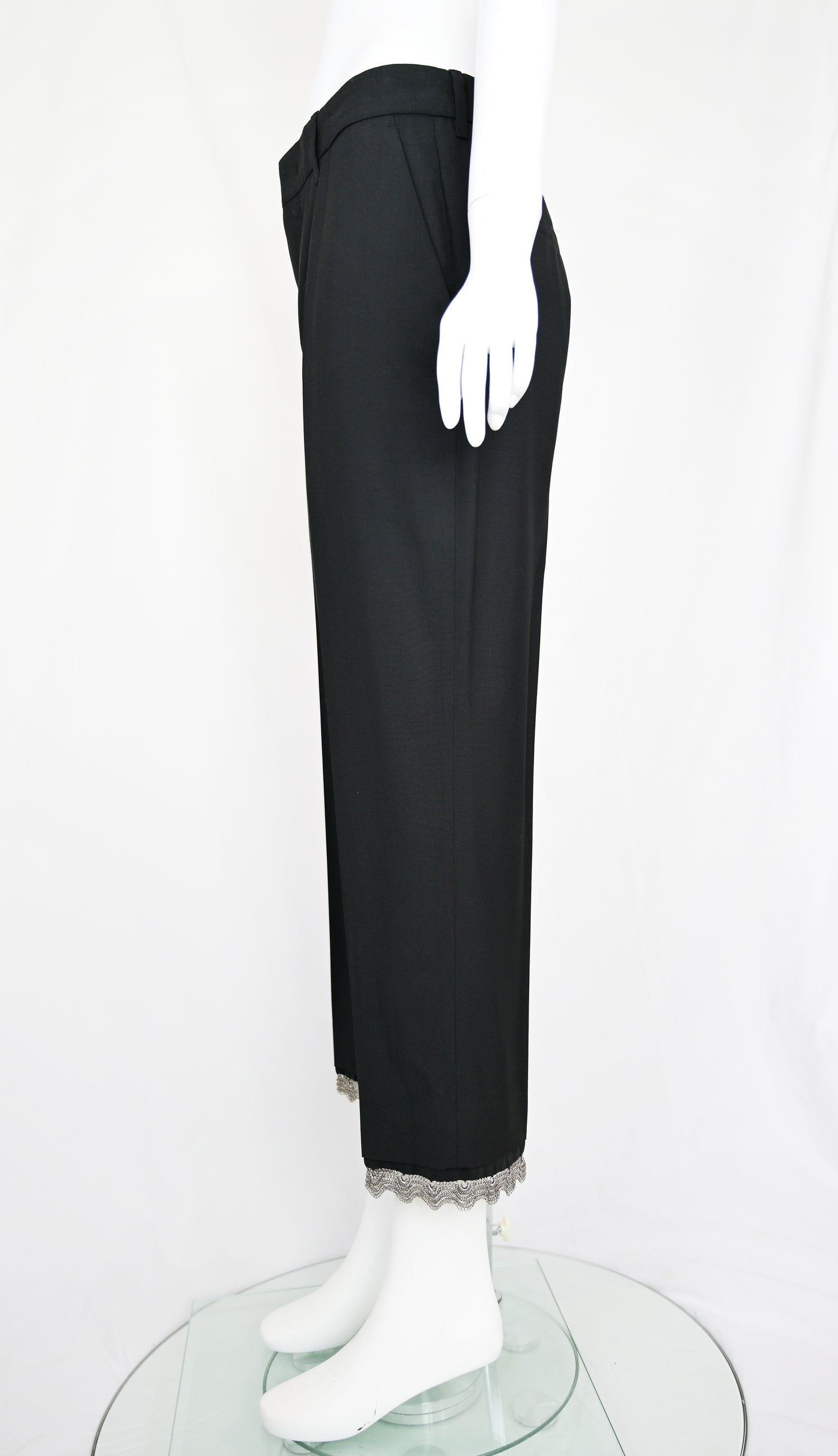 Elevate your wardrobe with these sophisticated formal trousers, where refined tailoring meets unexpected luxury. The distinctive chainmail accent trim at the hem adds an avant-garde touch that transforms classic elegance into a statement piece. Perfect for those who appreciate meticulous craftsmanship and desire to stand apart in professional or formal settings, these trousers deliver both polish and personality. The premium construction ensures a flattering silhouette while the chainmail detailing catches light beautifully and fluidly moves with every step, making them an investment in timeless style with modern edge.