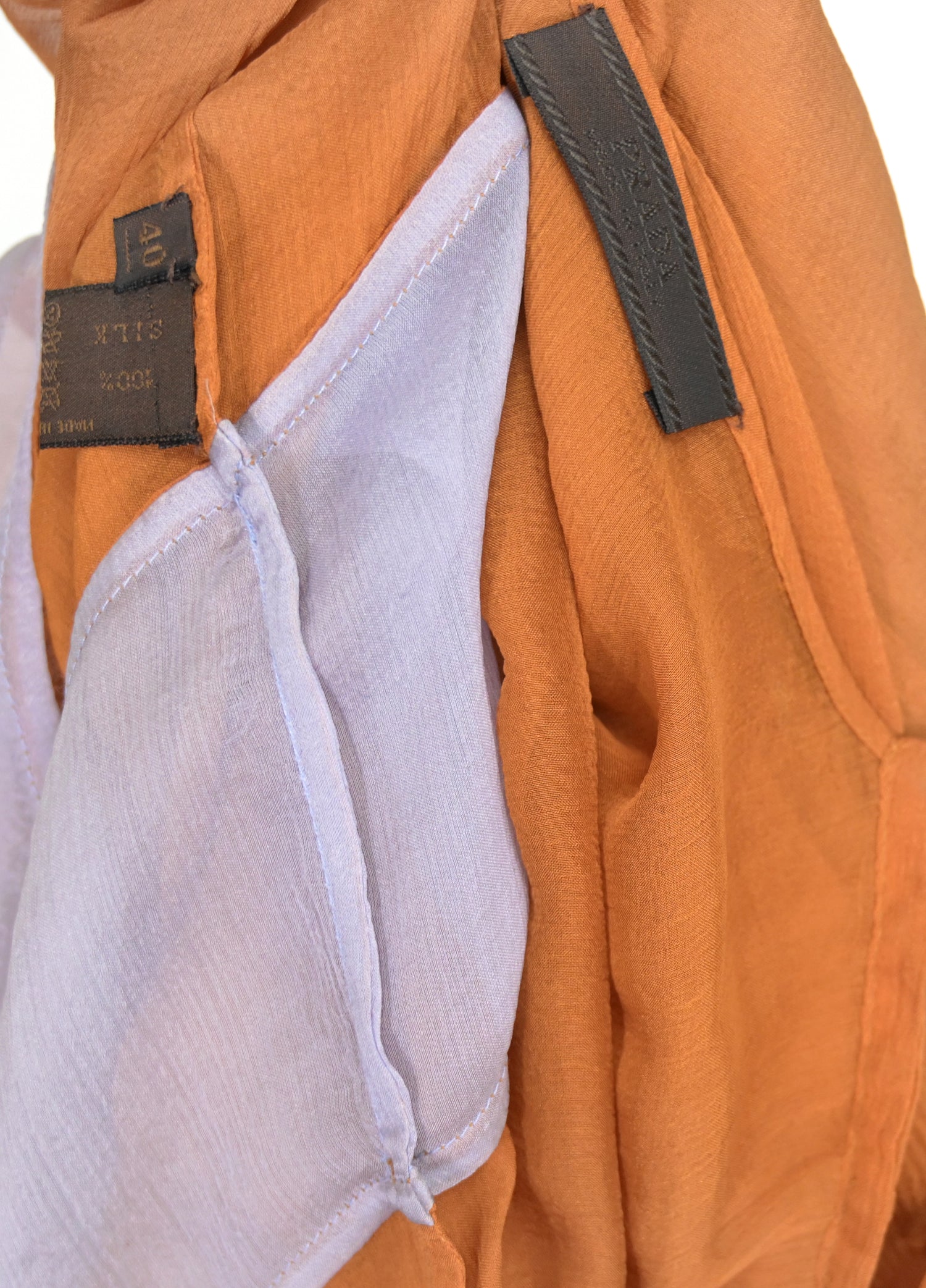 This elegant chiffon silk dress features a striking color block design in vibrant orange and soft lavender. As seen on the Prada FW 1996 runway and worn by Stella Tenant in a 1996 editorial, it combines lightweight comfort with a bold, stylish look perfect for any special occasion.