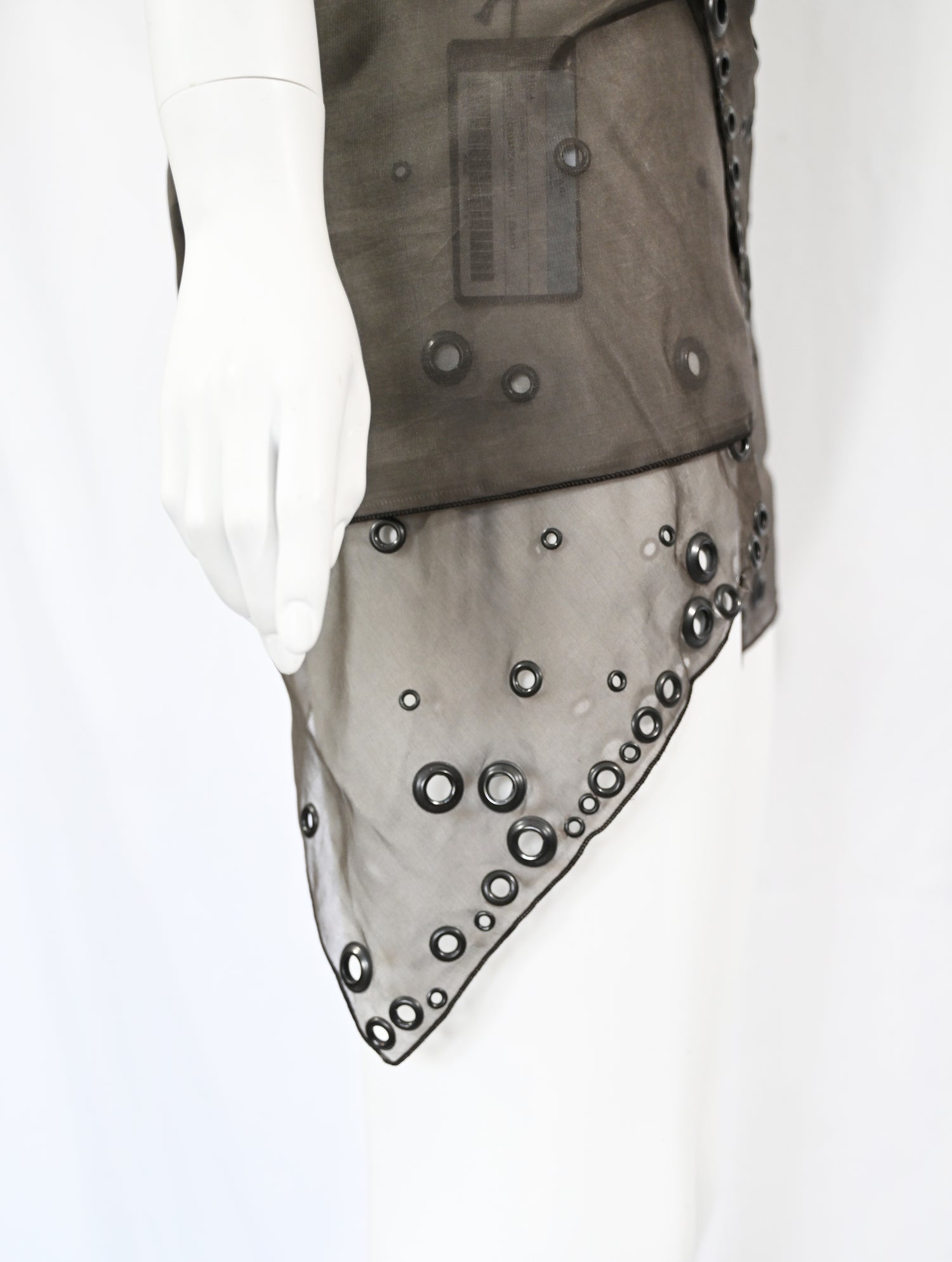 Beautiful silk organza scarf adorned with the 1999 collection's signature grommets. Large enough to be worn as a head covering.