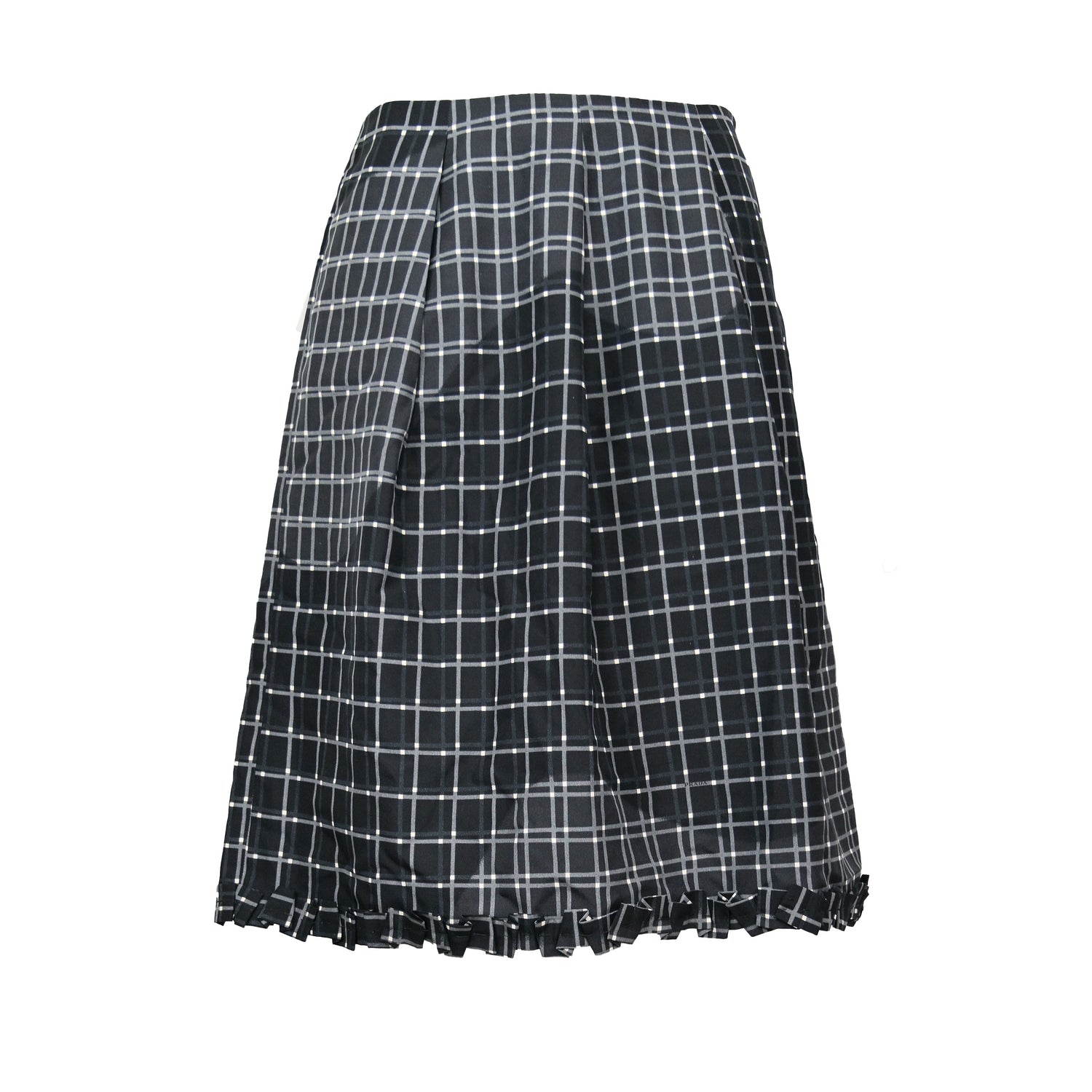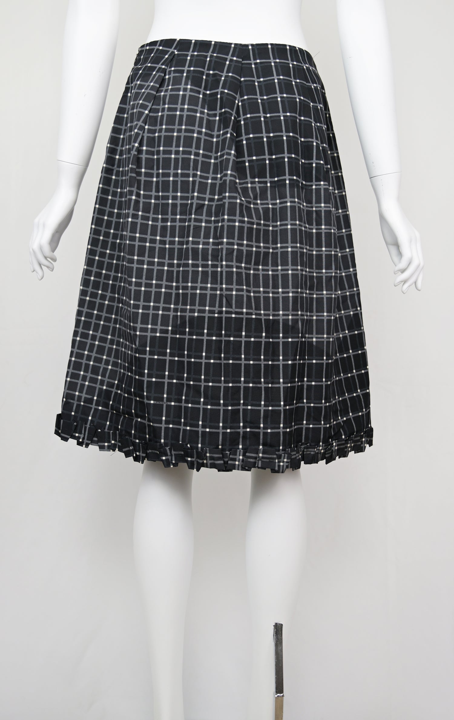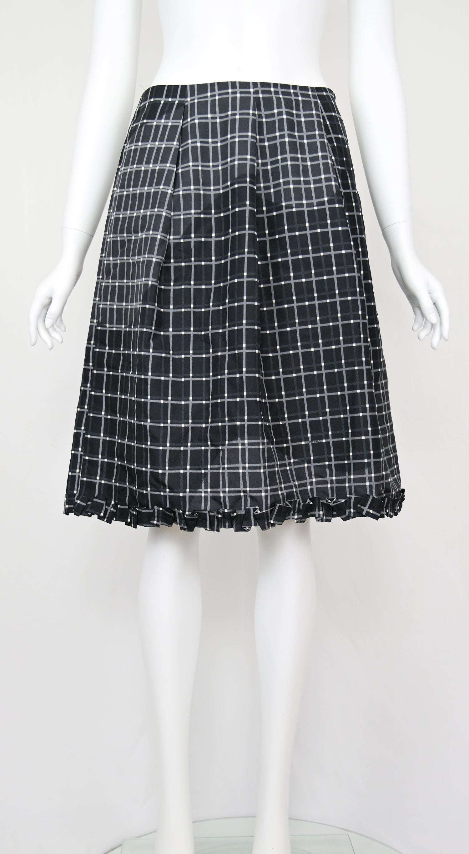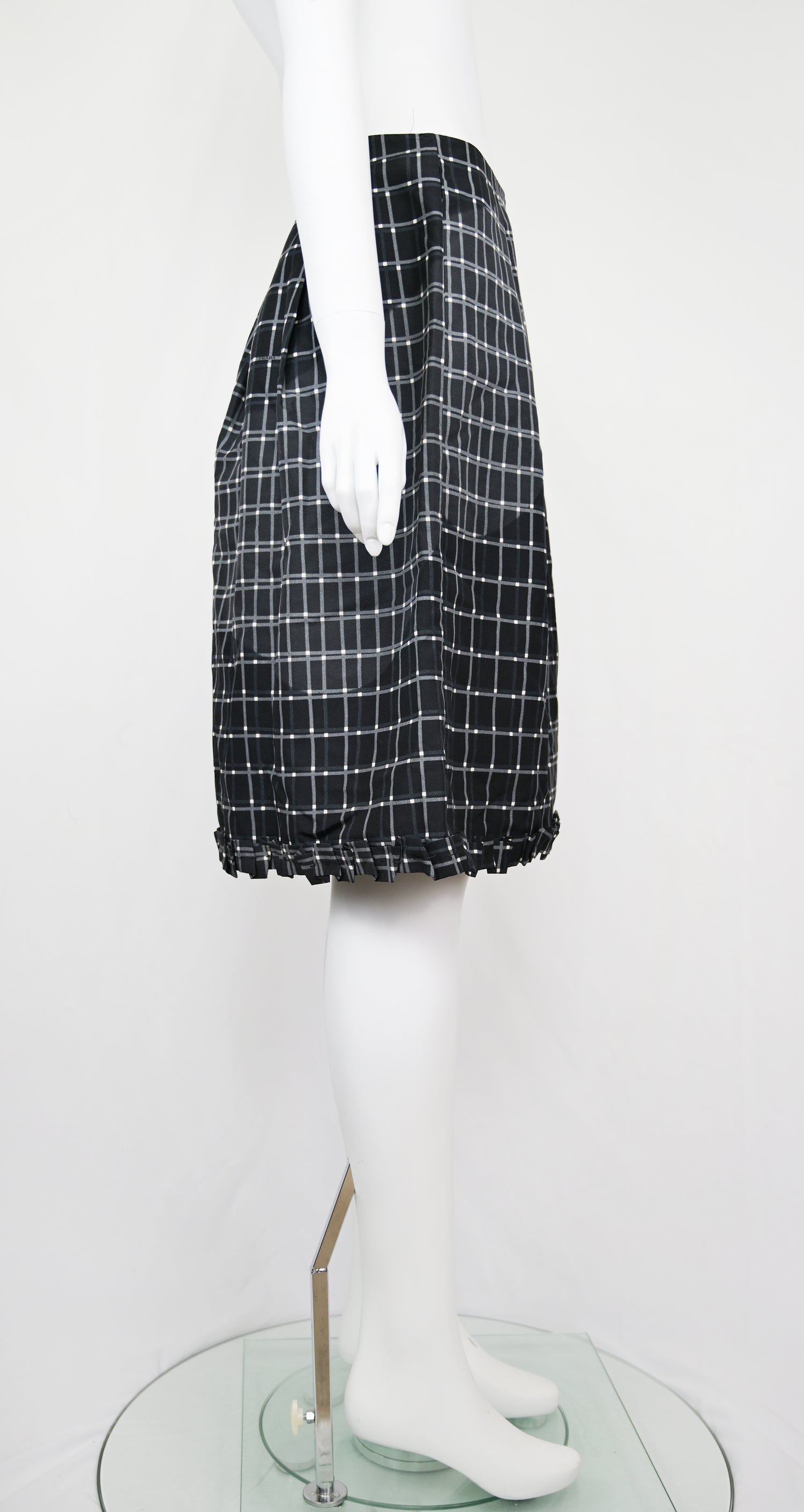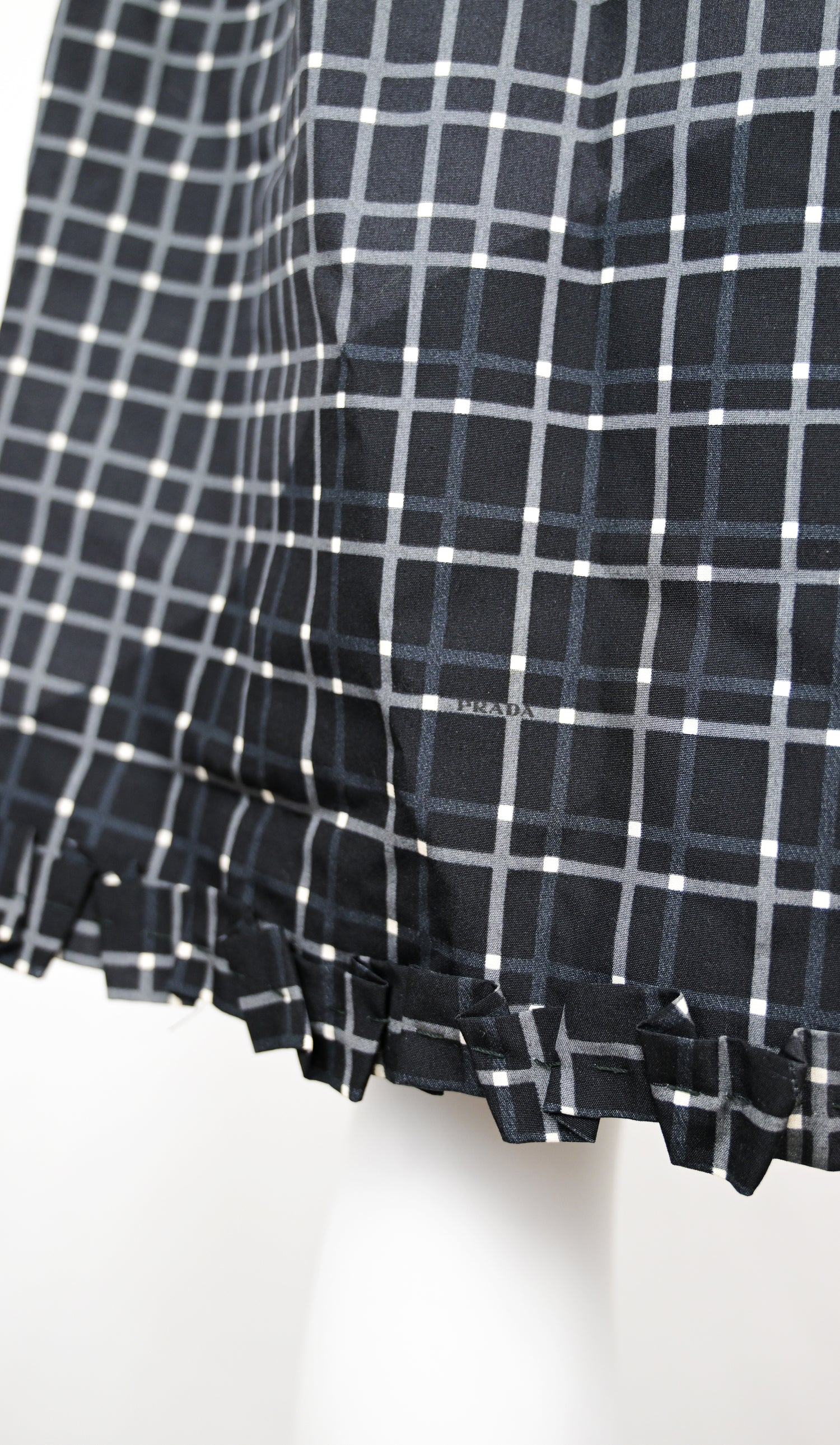 This Prada SS 1999 skirt features a unique gradient checked print that adds subtle color variation. Made from smooth silk, it offers a lightweight and comfortable fit. The folded overlap hem adds a stylish detail, making it a versatile piece for elegant and casual looks.