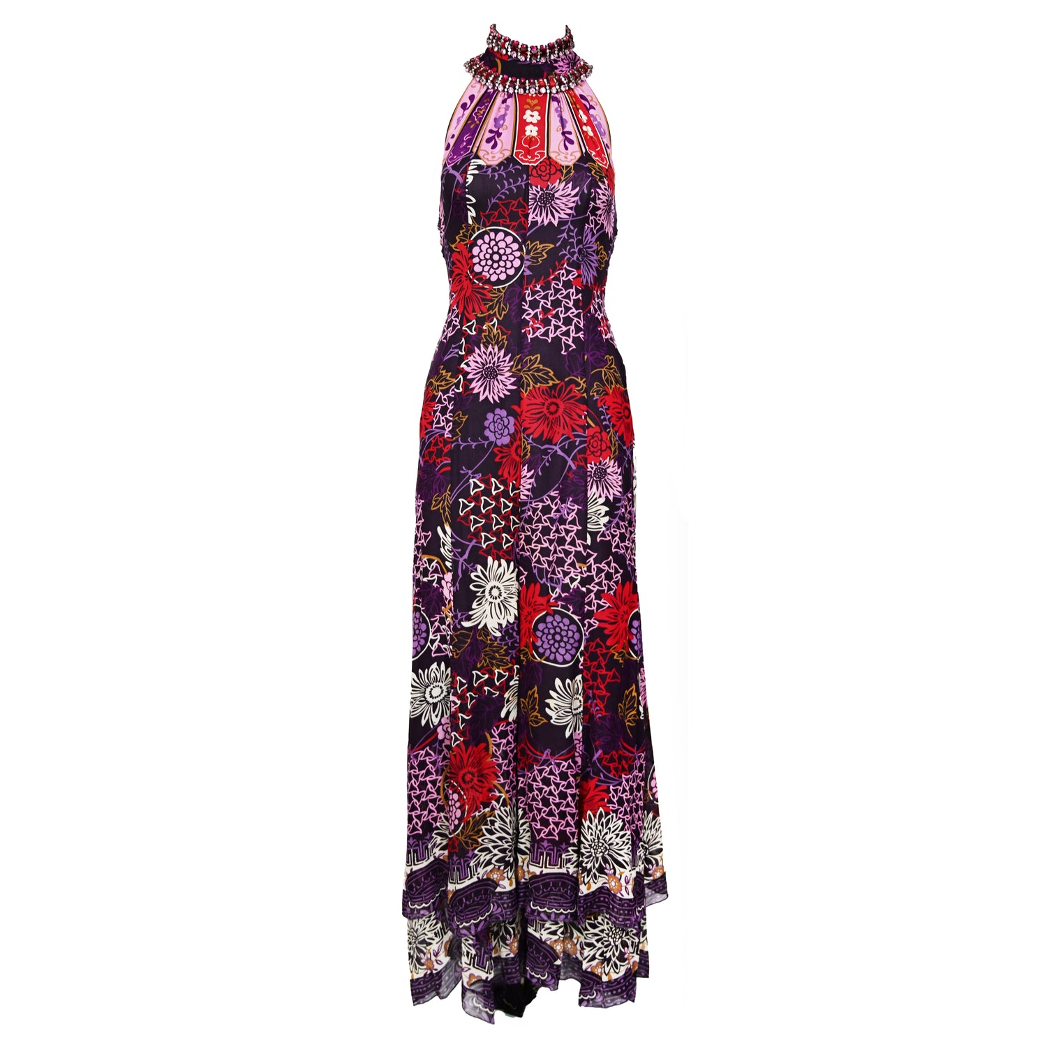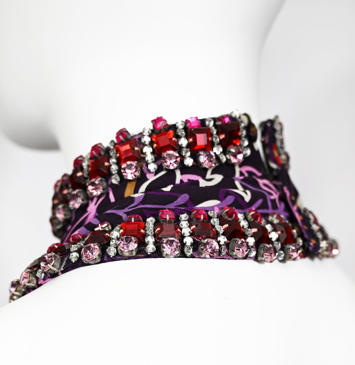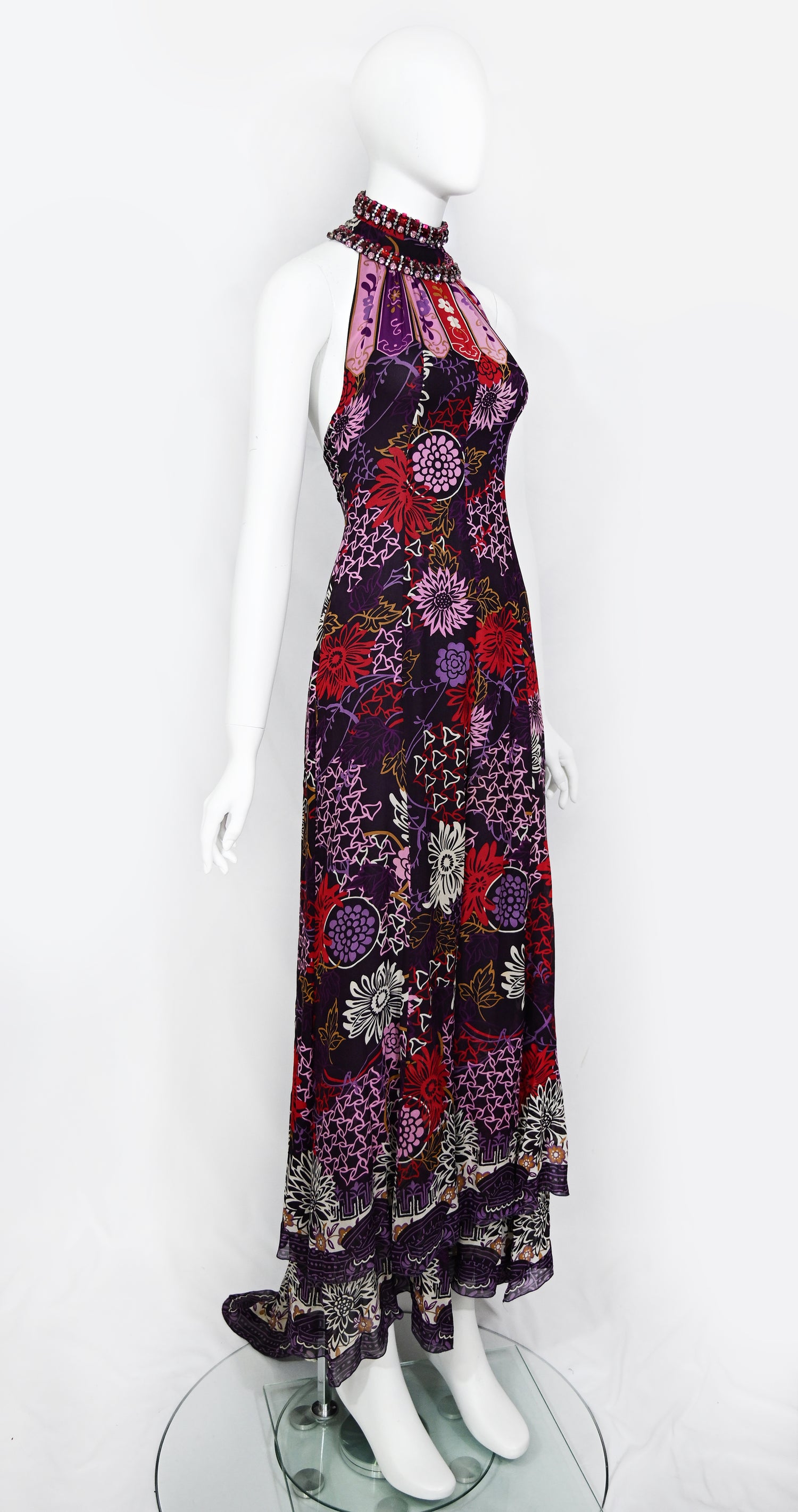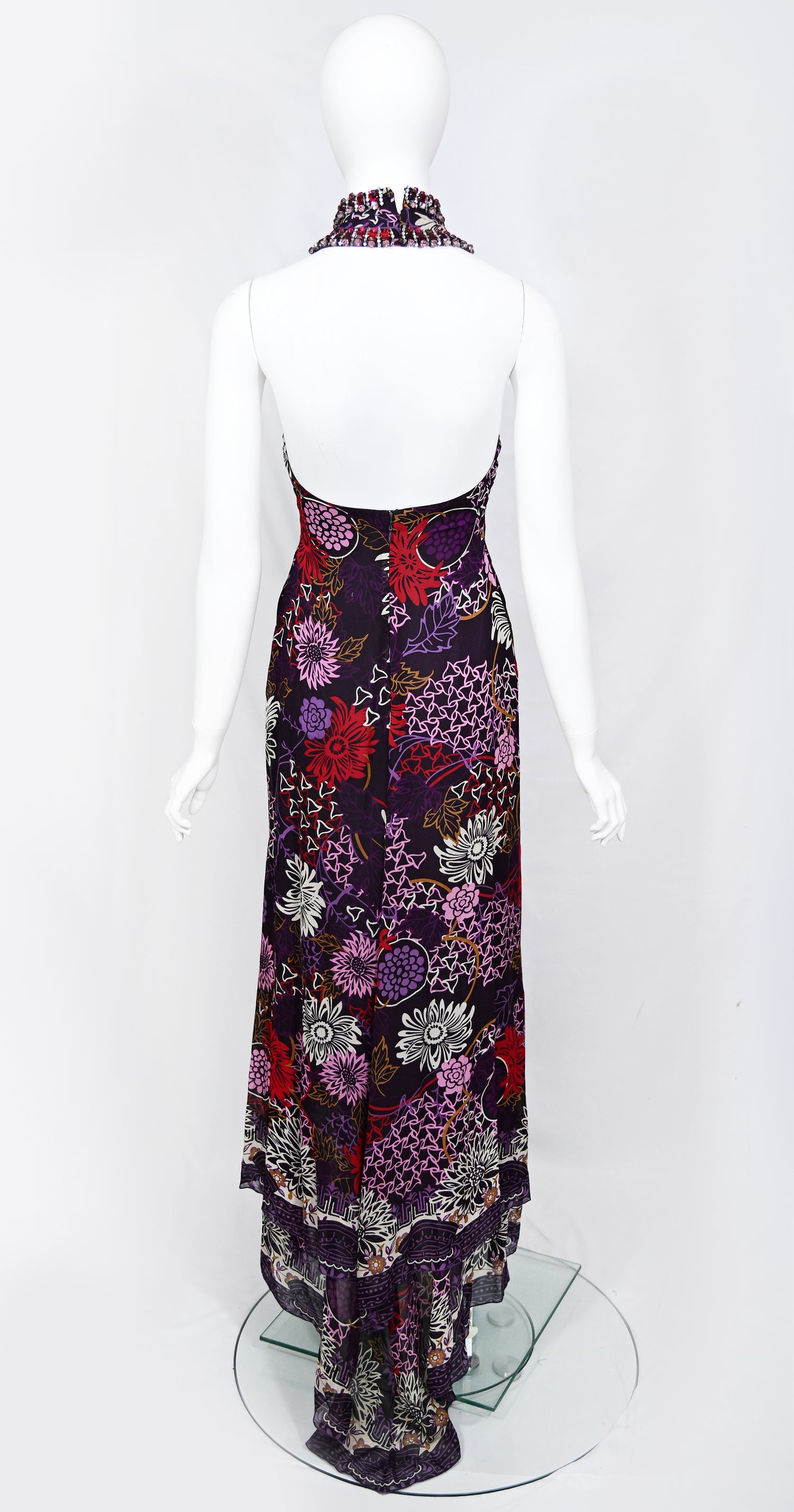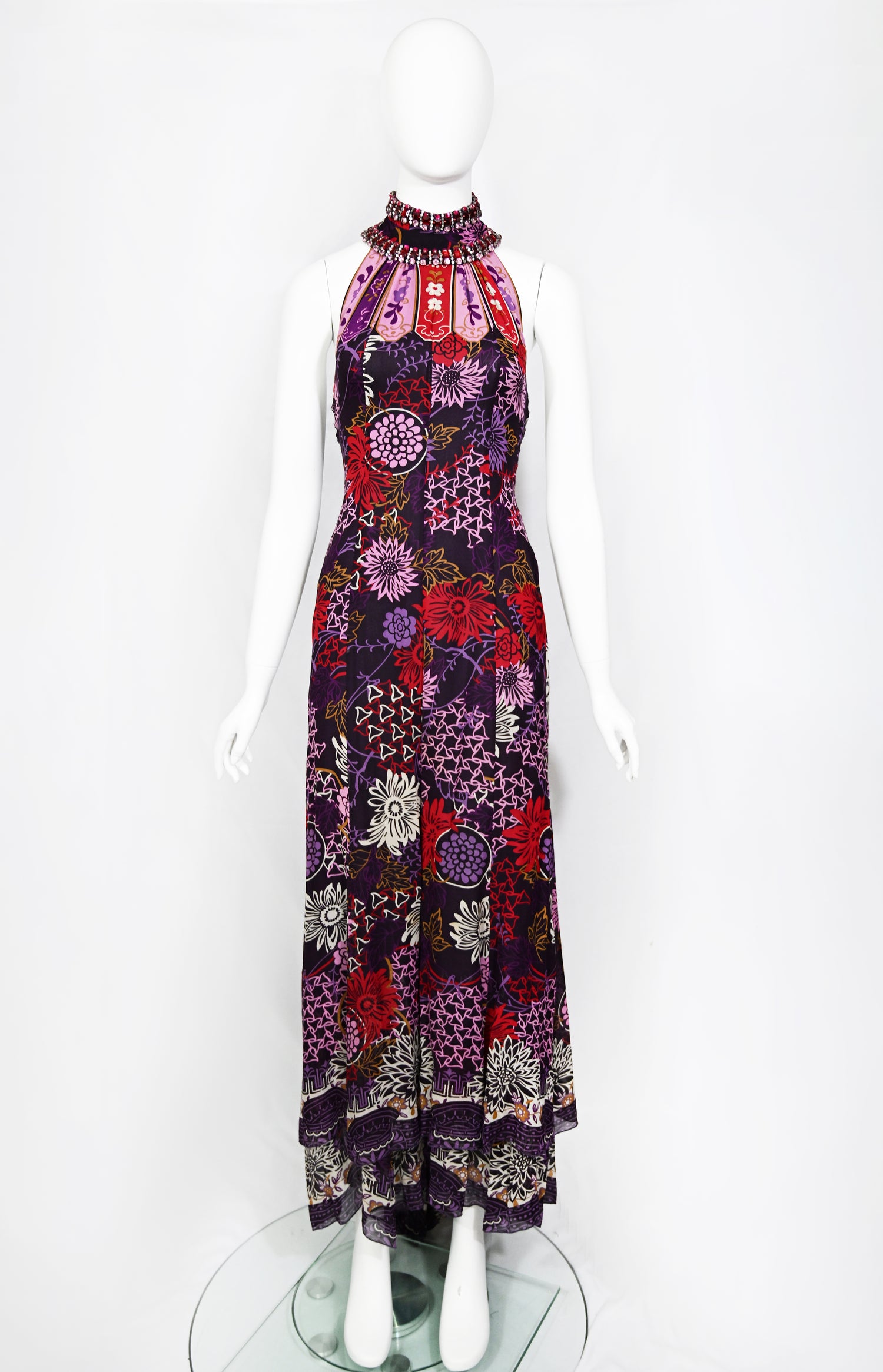 This rare Valentino piece from the Fall Winter 2006 collection showcases a striking reimagined floral print from the 1970 Valentino collection. The show-stopping gem and rhinestone-embellished collar is expertly tailored to elongate the neck and frame the face, eliminating the need for additional jewelry. The fitted bodice flows into luxurious layers of silk chiffon, culminating in a subtle train that adds movement and grace. An open back provides perfect balance, allowing the bold print and ornate collar to command attention while maintaining sophisticated proportion and flattering silhouette.