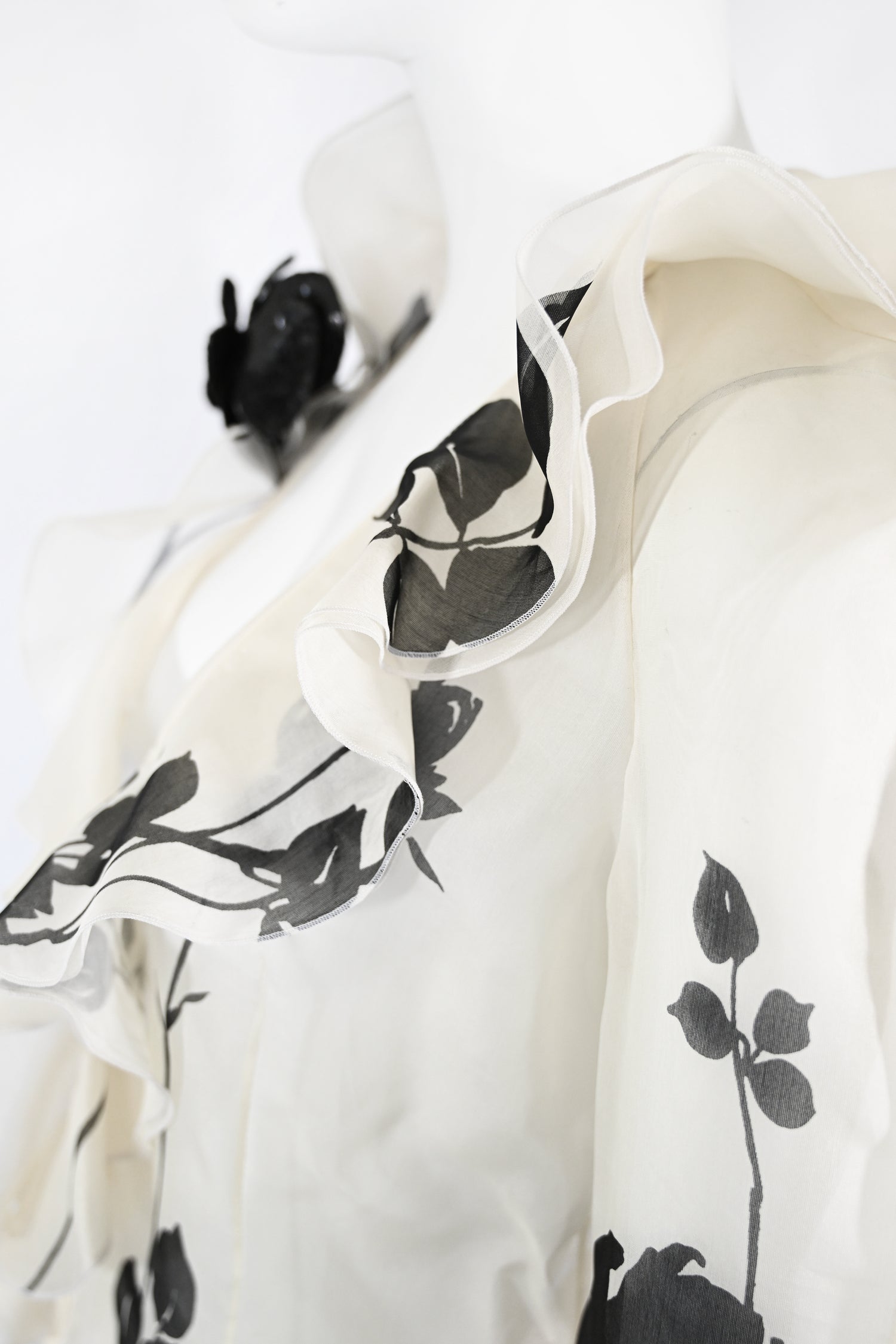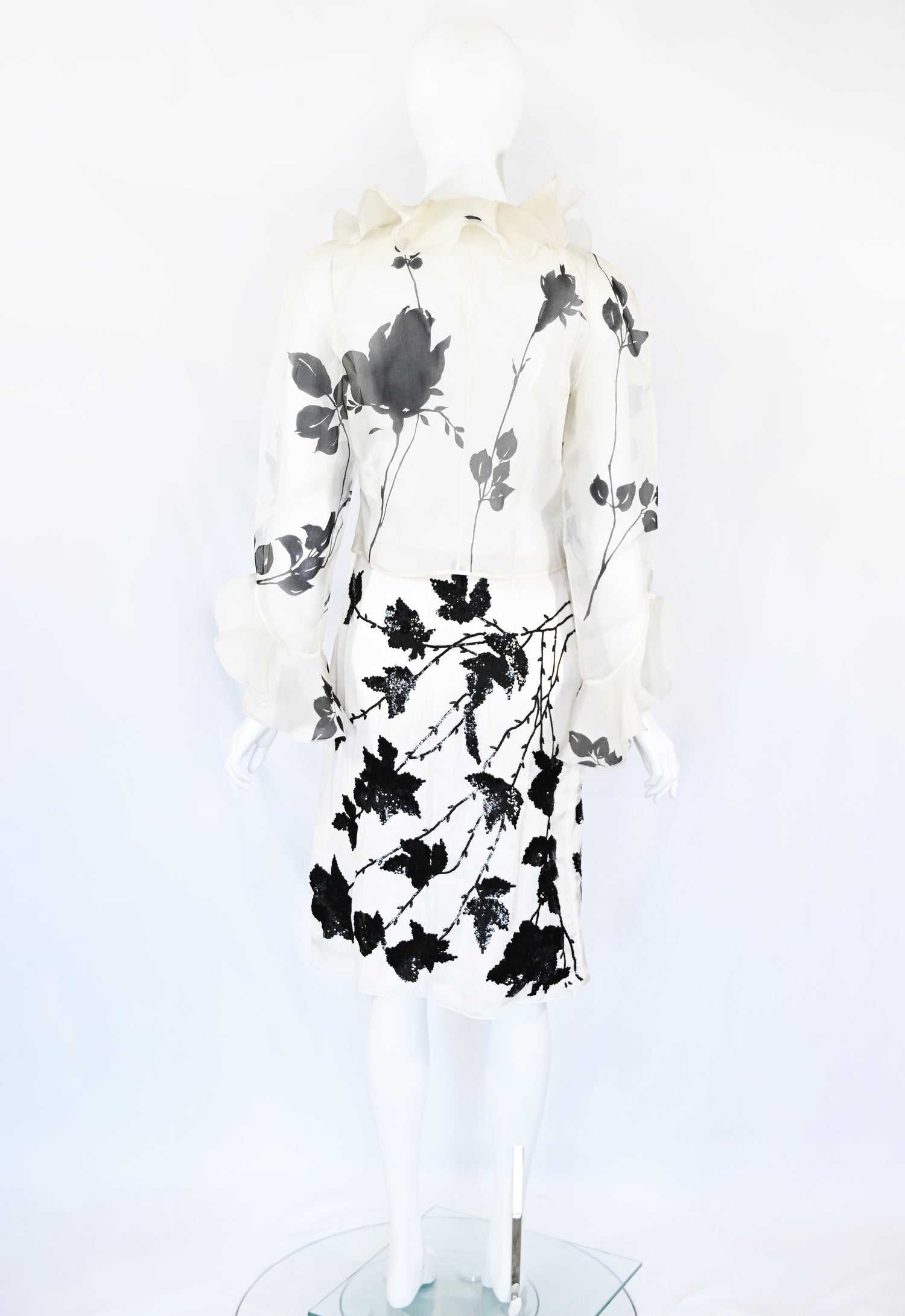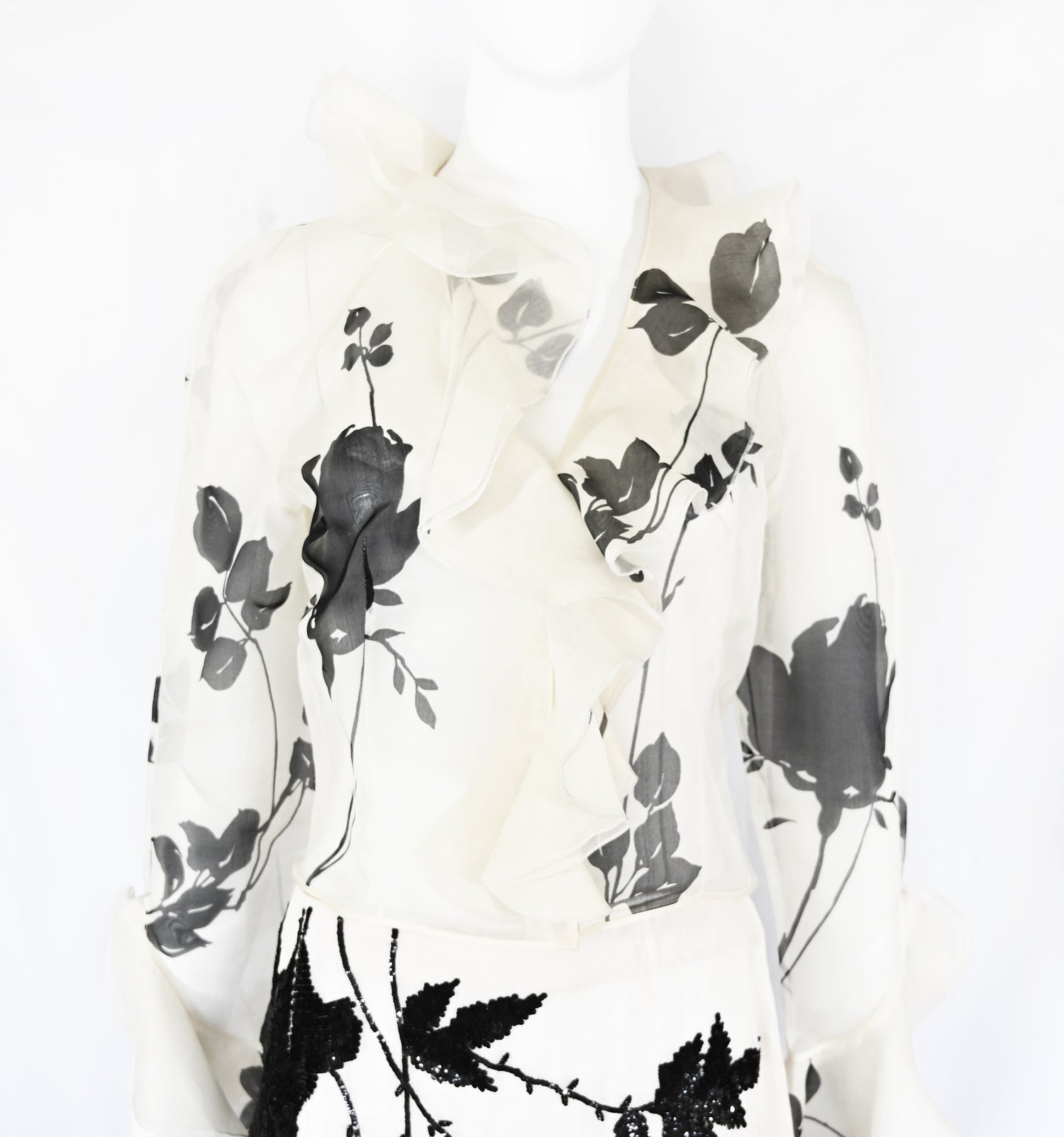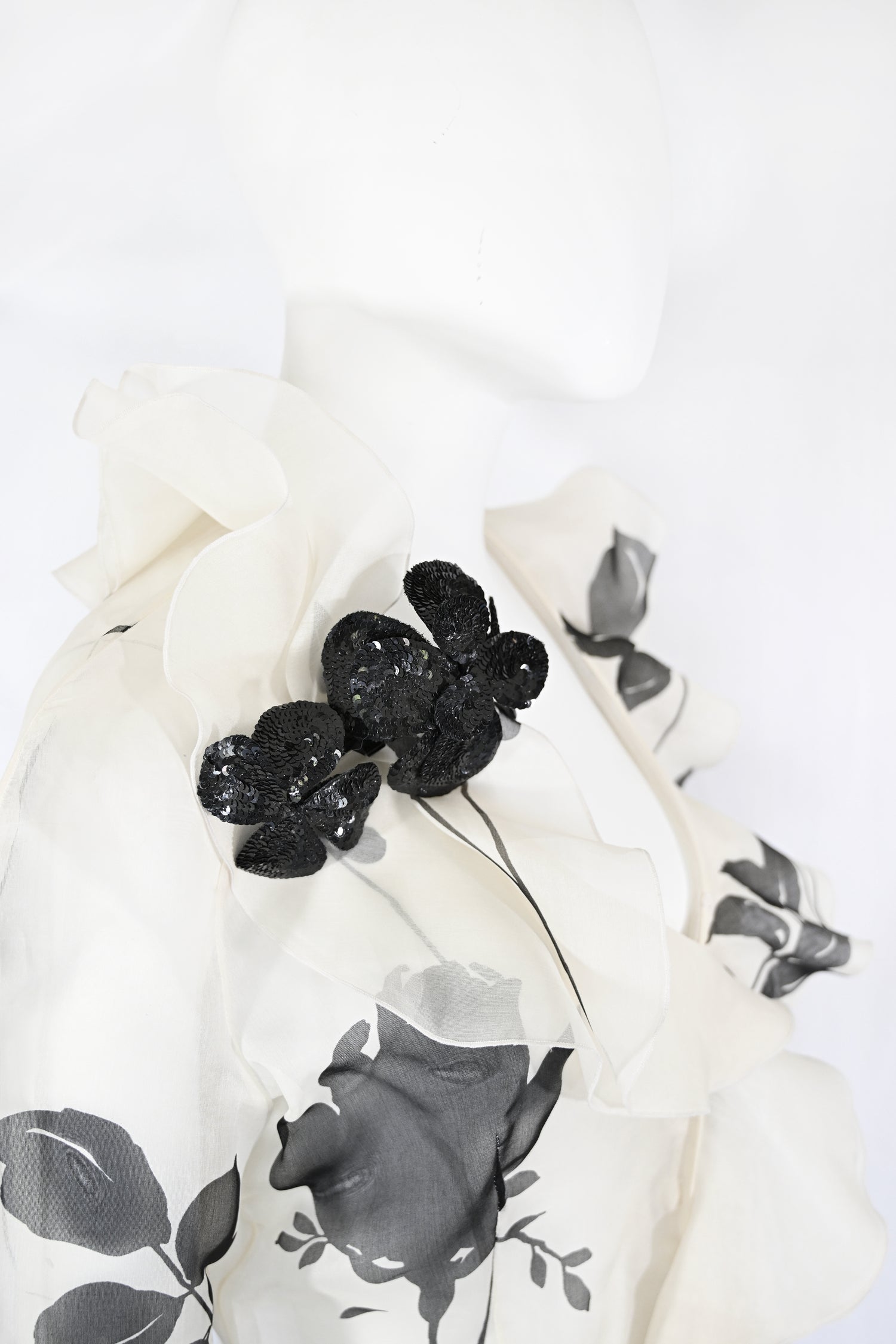 Valentino's Spring/Summer 2001 collection piece showcases the house's signature elegance. This three-piece ensemble features a gossamer silk blouse with an ethereal ruffled collar and gradient floral print, paired with a layered silk skirt adorned with intricate bead and sequin floral embroidery. The sculptural sequin flower brooch—designed as a detachable pin—adds a striking finishing touch. Each element demonstrates Valentino's mastery of luxurious fabrics and ornamental detail, creating a refined silhouette perfect for elevated occasions.