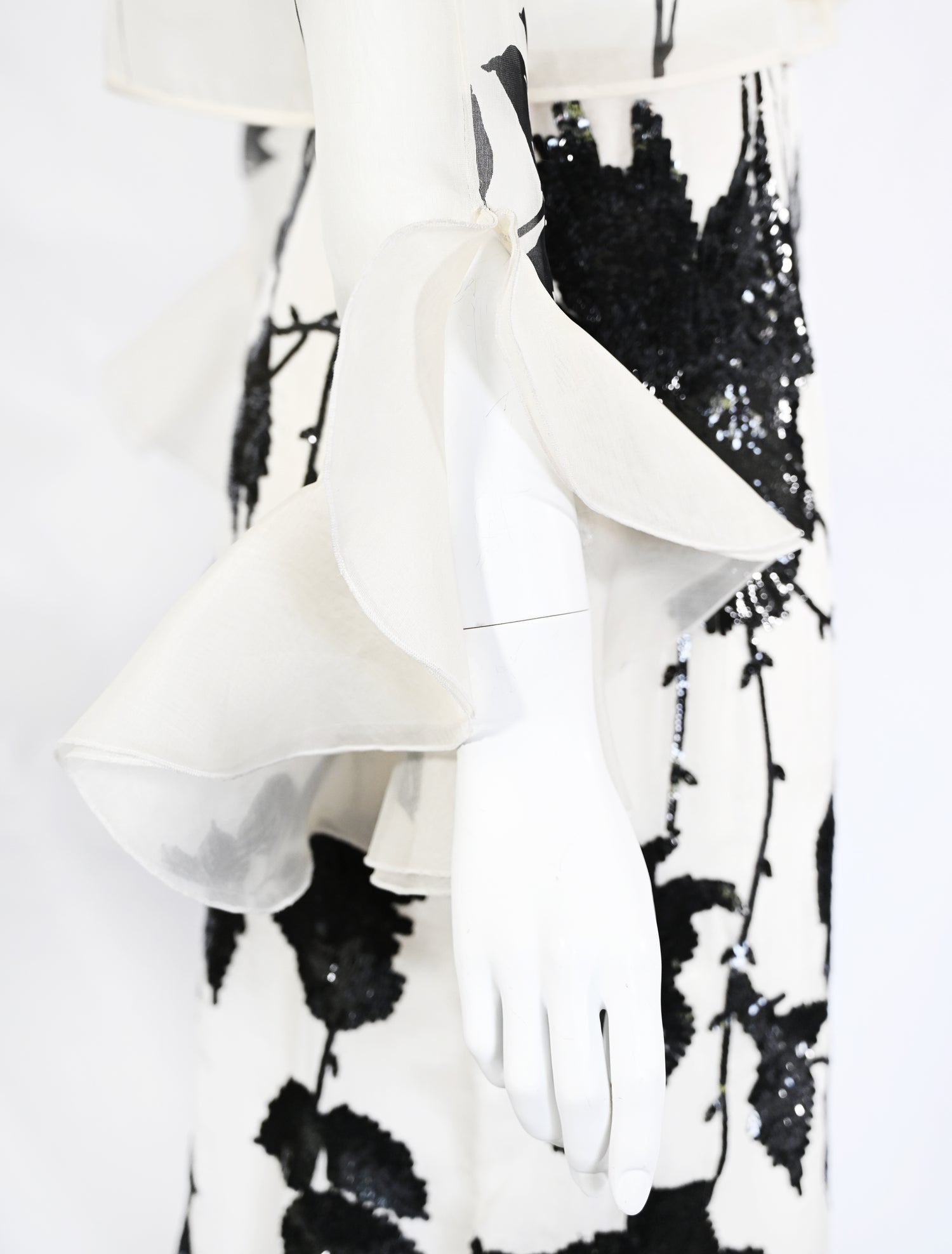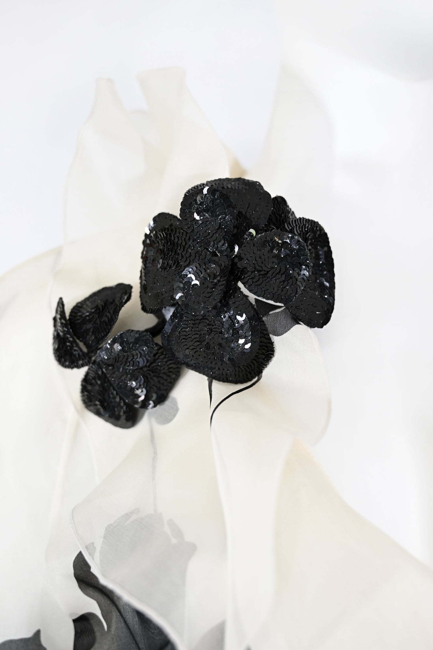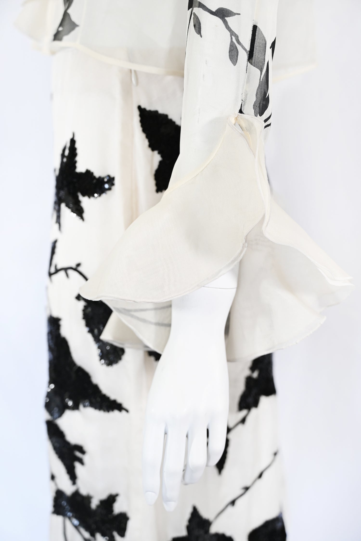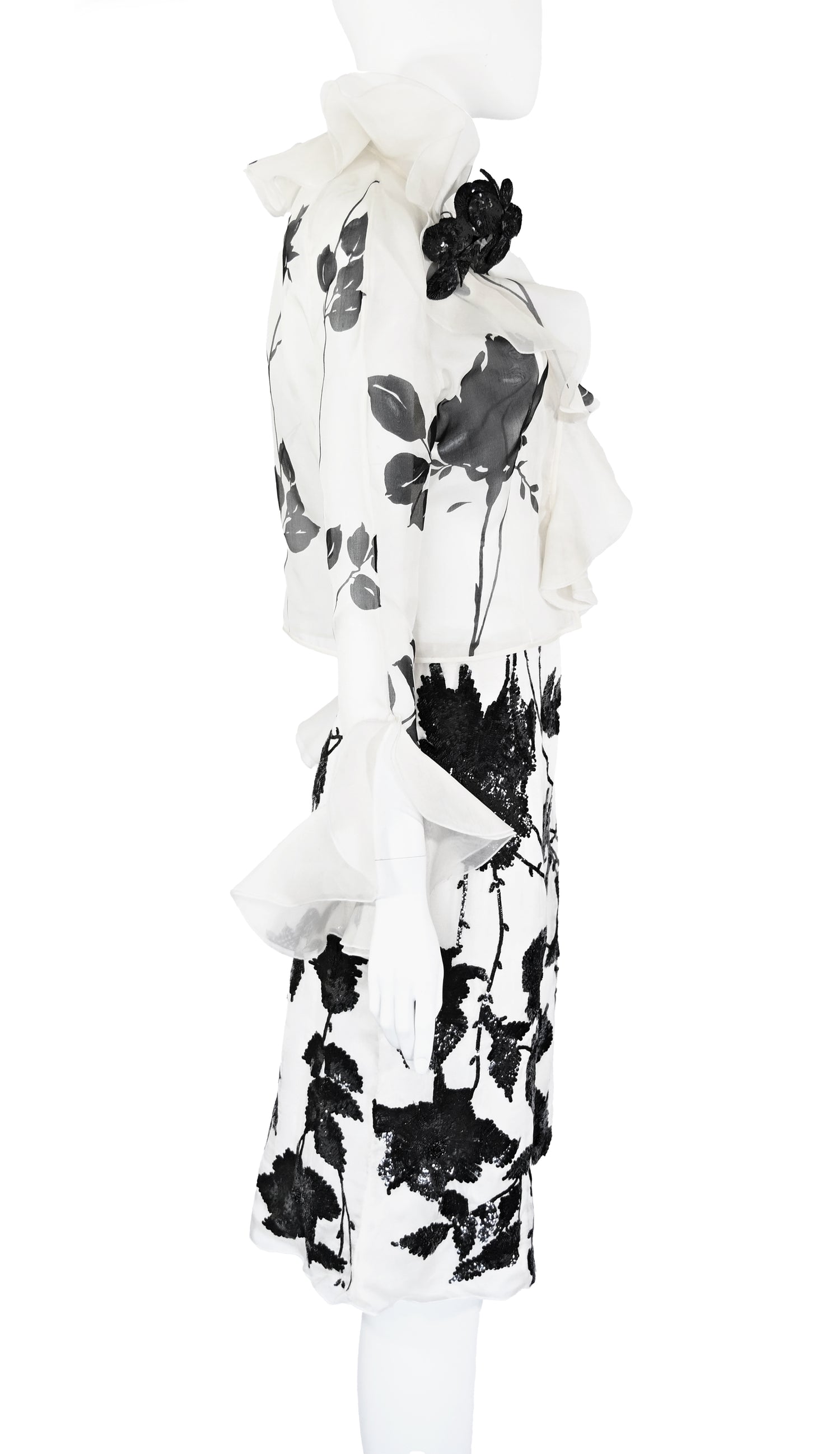 Valentino's Spring/Summer 2001 collection piece showcases the house's signature elegance. This three-piece ensemble features a gossamer silk blouse with an ethereal ruffled collar and gradient floral print, paired with a layered silk skirt adorned with intricate bead and sequin floral embroidery. The sculptural sequin flower brooch—designed as a detachable pin—adds a striking finishing touch. Each element demonstrates Valentino's mastery of luxurious fabrics and ornamental detail, creating a refined silhouette perfect for elevated occasions.