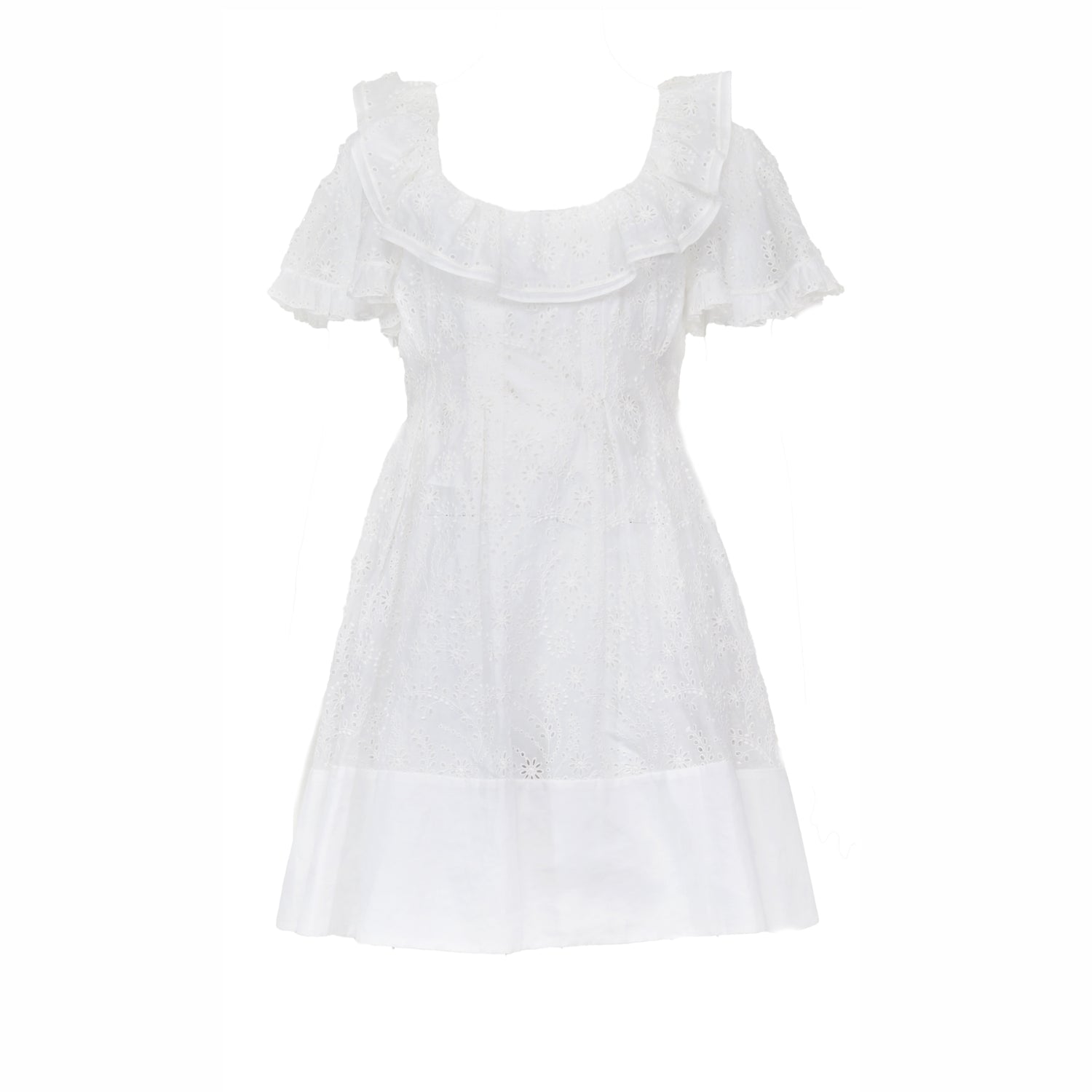 Introducing our Valentino Resort 2019 Ruffled Broderie Eyelet Cotton Mini Dress. Exquisitely crafted from crisp cotton, this dress is designed in a perfect milkmaid silhouette that will flatter any figure. The intricate eyelet design adds a touch of luxury and elegance to this already stunning piece. Elevate your style to the next level with this must-have dress.